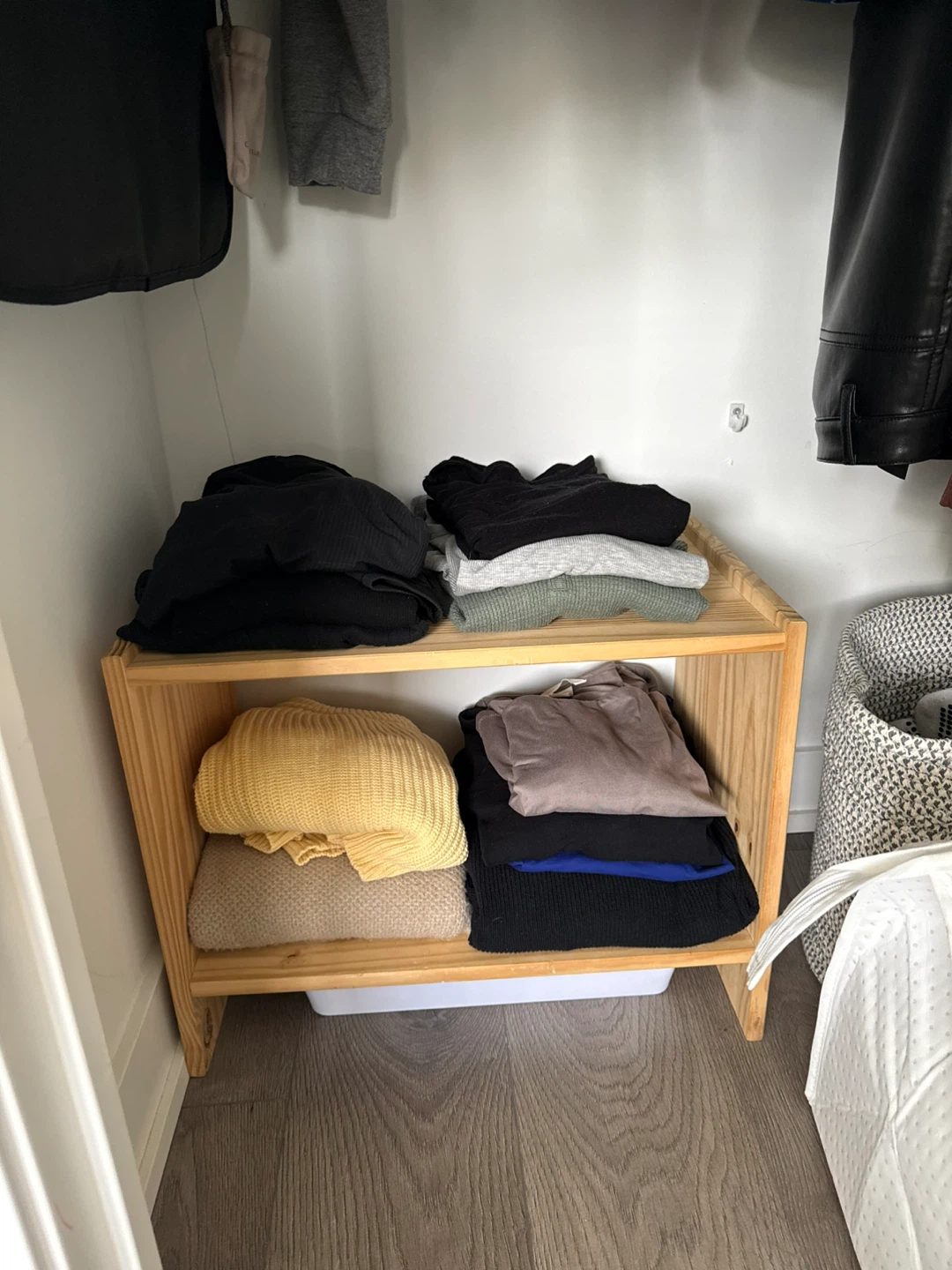 This is a simple wooden shelf unit. It's great for organizing folded clothes. The shelves are made of light-coloured wood.