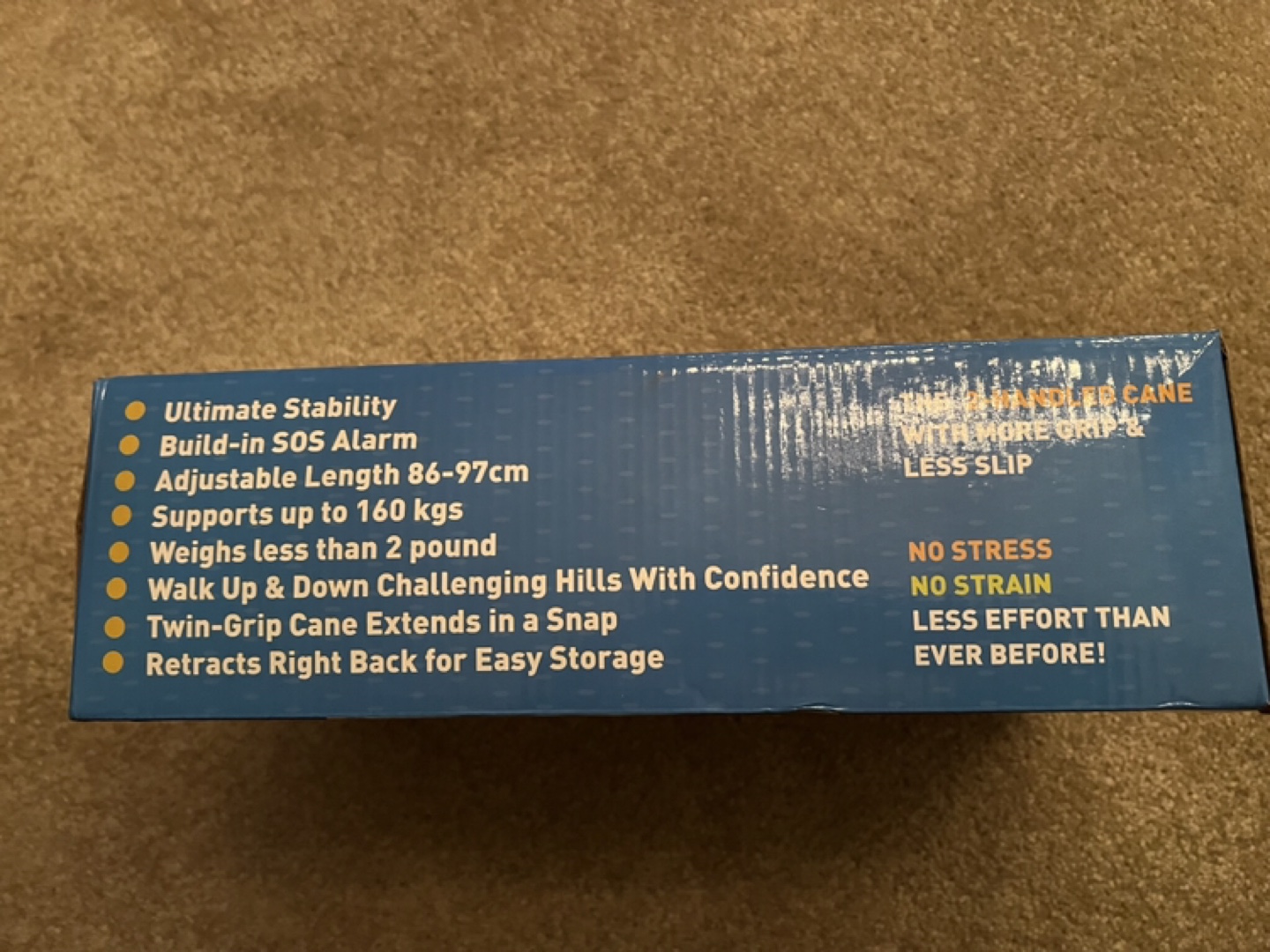 Folding cane with adjustable length, LED light, SOS alarm, and double handle design. The cane folds for easy storage. The cane is made of durable materials and can support up to 160 kg.