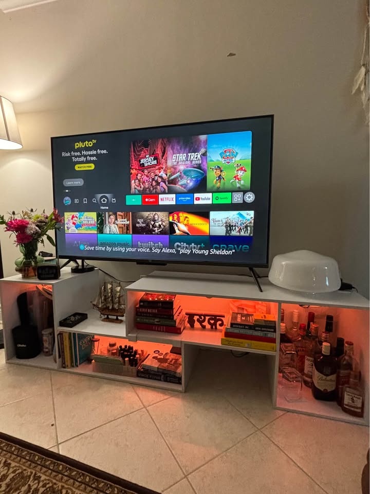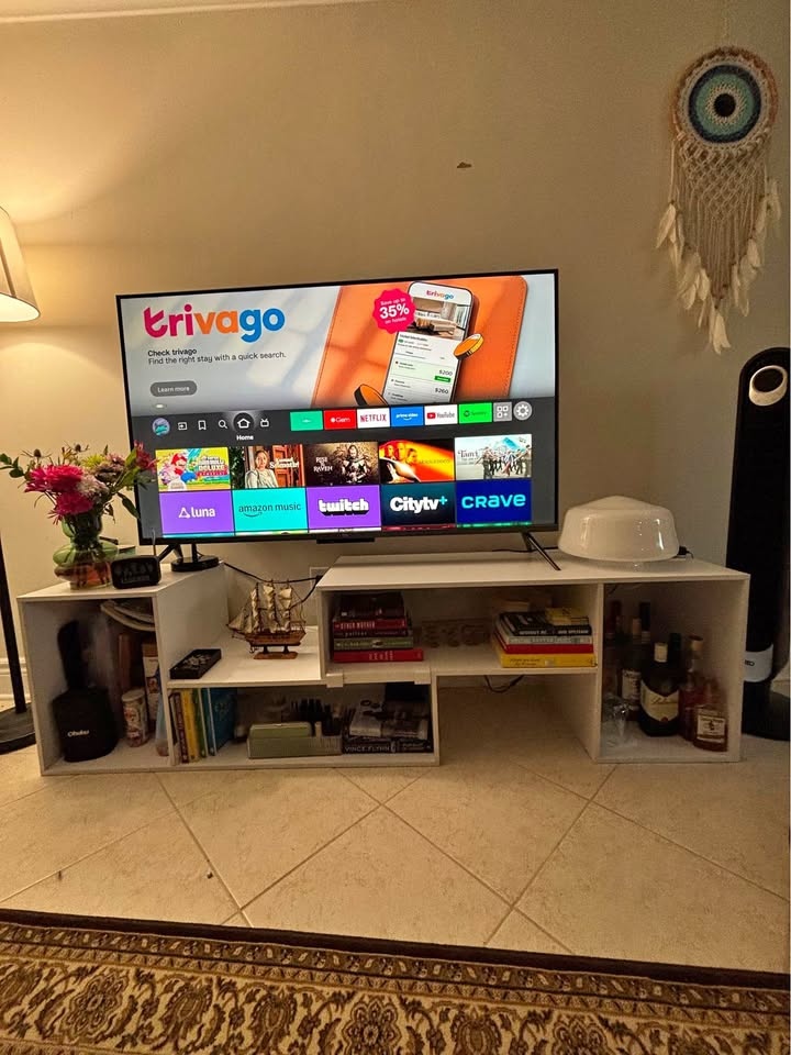 Clean white modular TV stand with multiple cube storage compartments. Great for holding your TV, books, and decor. Has inbuilt LED lights and a charging station. Super versatile for any living space. Pick up at Mavis Rd & Central Pkwy W. Cash or e-transfer accepted.