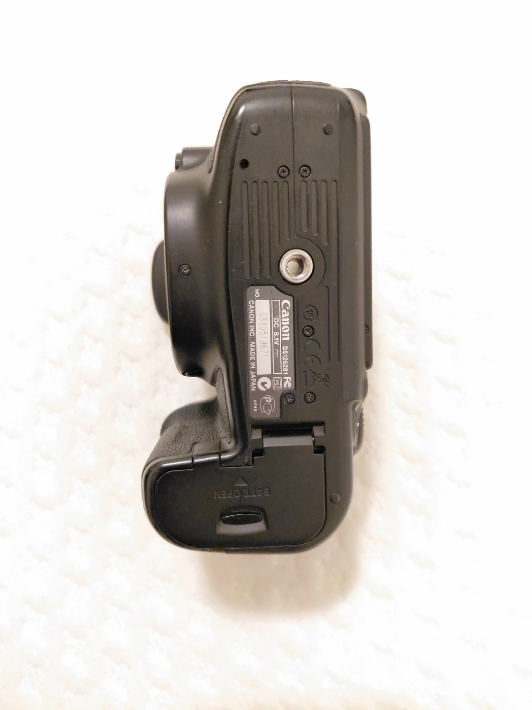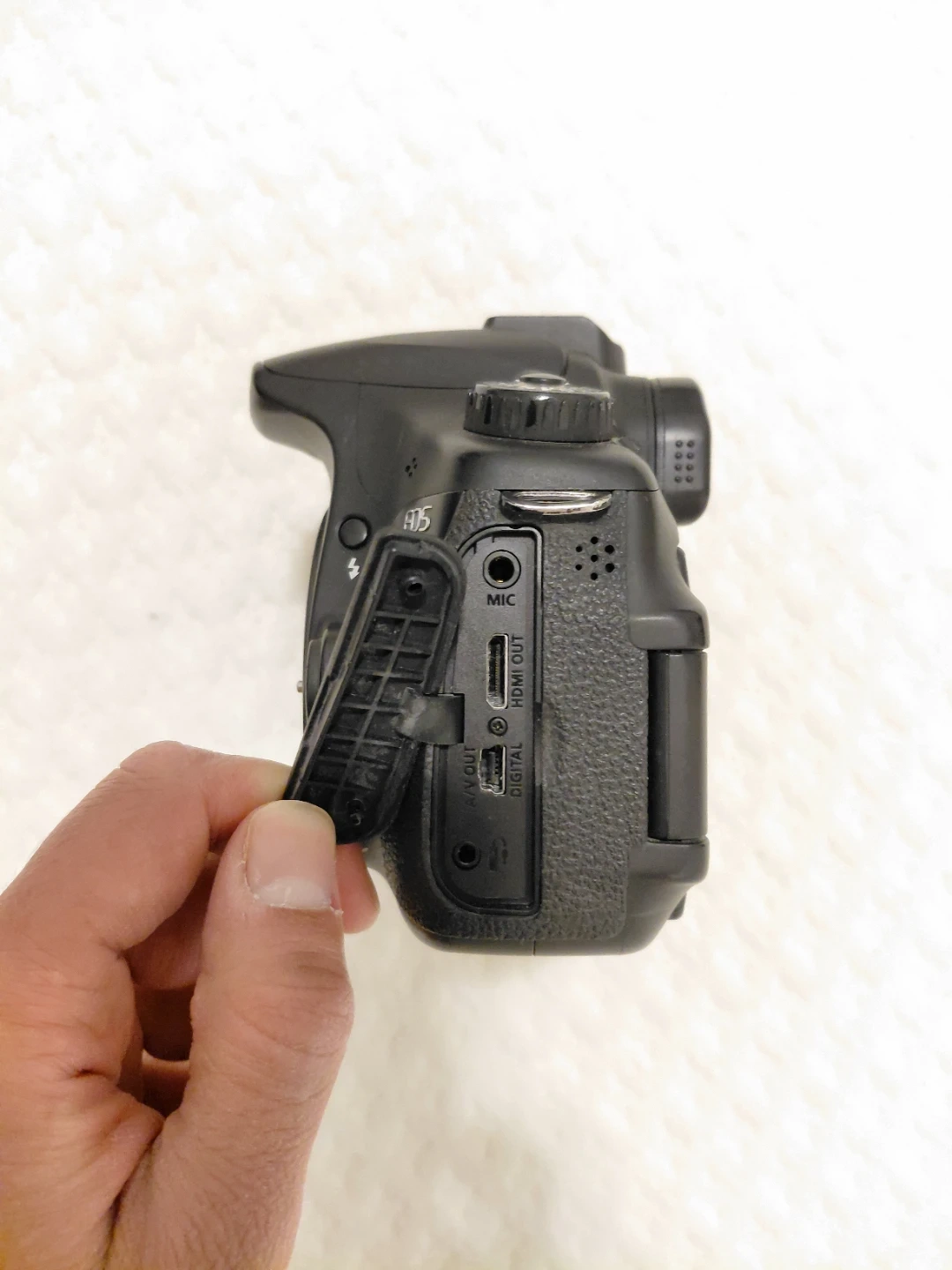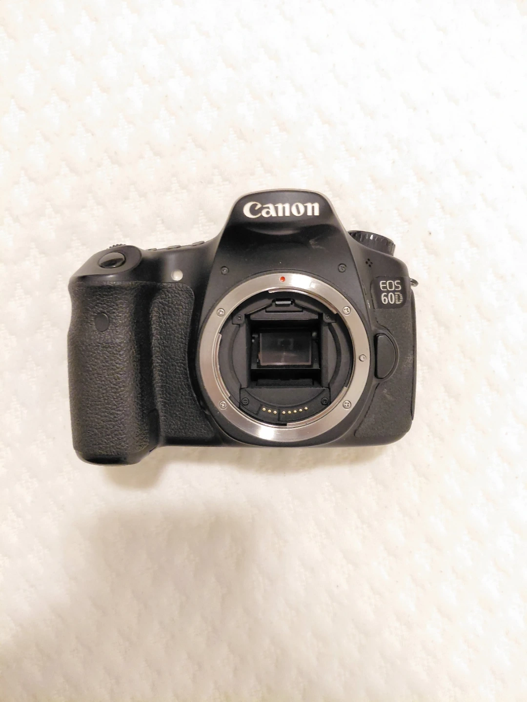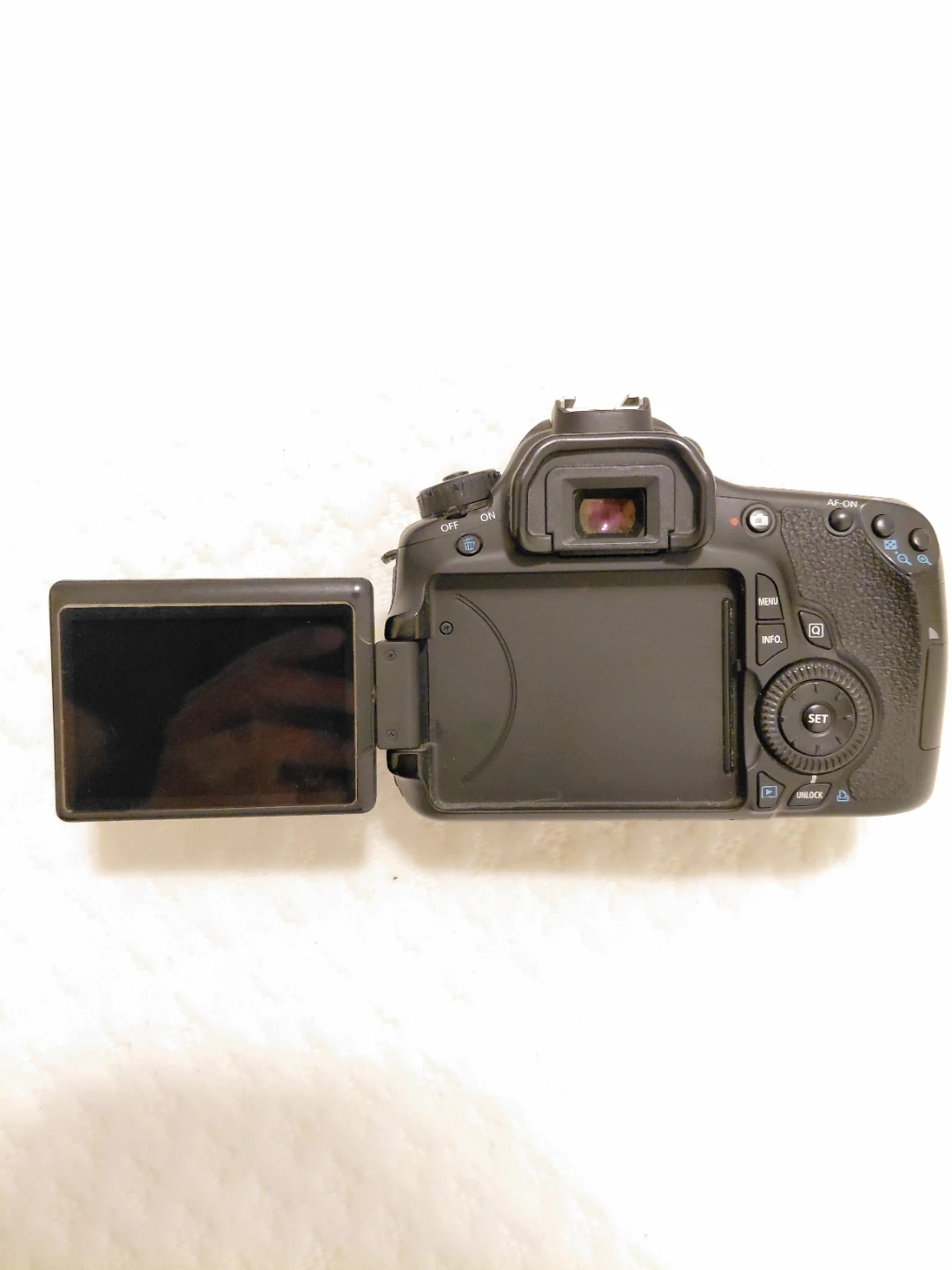 This is a Canon EOS 60D DSLR camera. It has a flip-out LCD screen. Ports include HDMI, USB, and microphone input.
