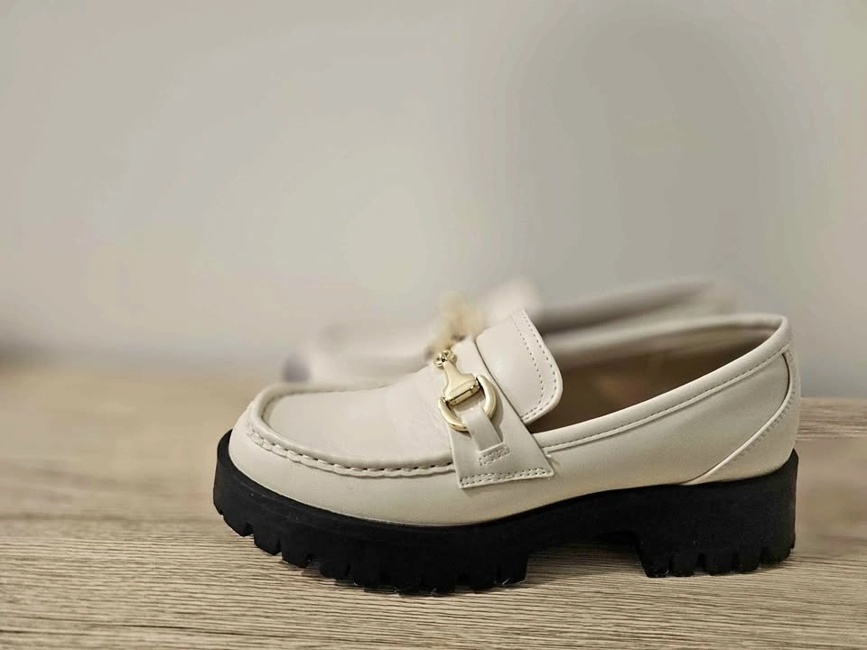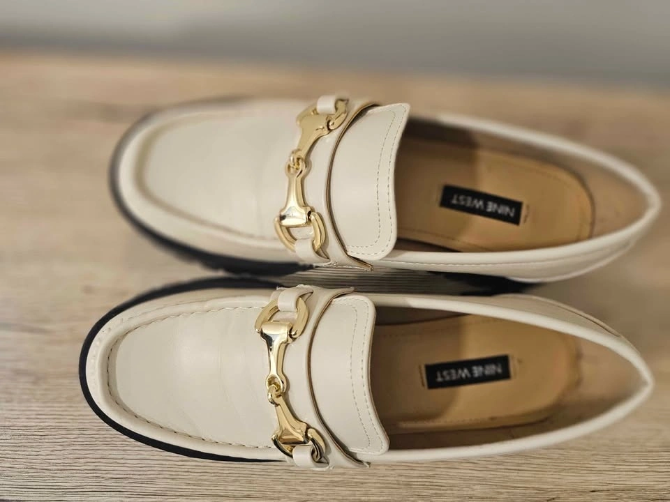 Stylish Nine West cream chunky loafers with a cool black sole and a gold horsebit detail. Super comfy and versatile. Size didn't fit me. Size 6.5