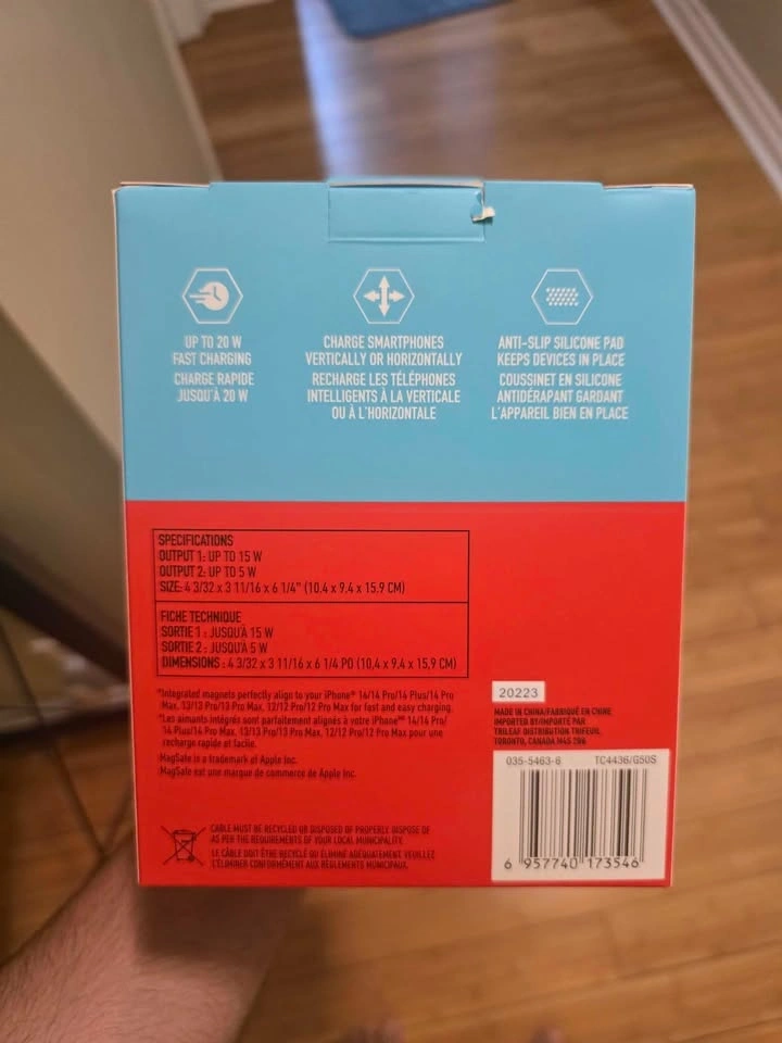 New Blue Hive 2-in-1 magnetic wireless charging station. MagSafe compatible, super convenient. Has up to 20W fast charging. Charges phones vertically or horizontally. Also has an anti-slip silicone pad to keep devices in place. Output 1 is up to 15W, Output 2 is up to 5W. Size is about 4 3/32 x 3 11/16 x 6 1/4 inches.