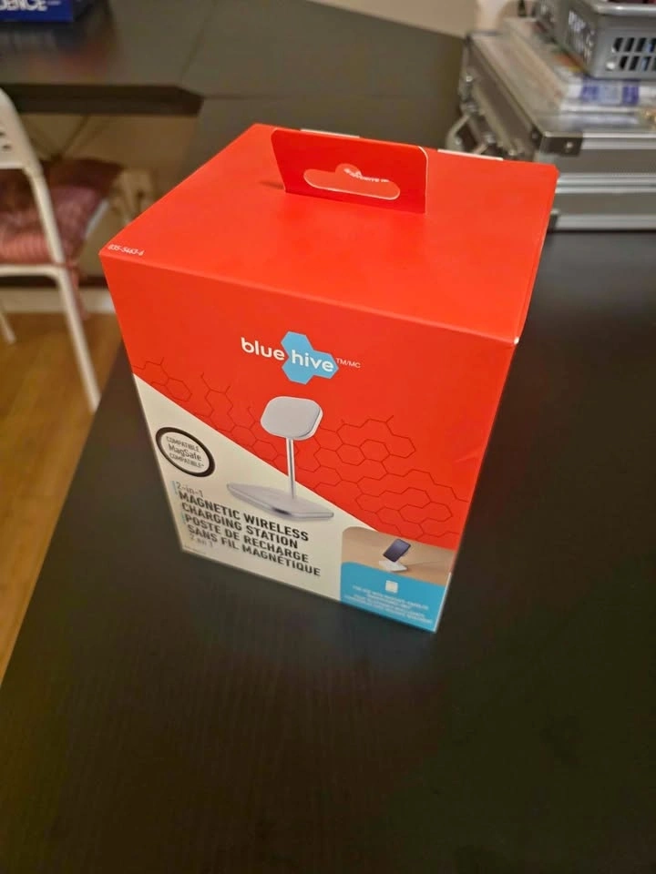 New Blue Hive 2-in-1 magnetic wireless charging station. MagSafe compatible, super convenient. Has up to 20W fast charging. Charges phones vertically or horizontally. Also has an anti-slip silicone pad to keep devices in place. Output 1 is up to 15W, Output 2 is up to 5W. Size is about 4 3/32 x 3 11/16 x 6 1/4 inches.