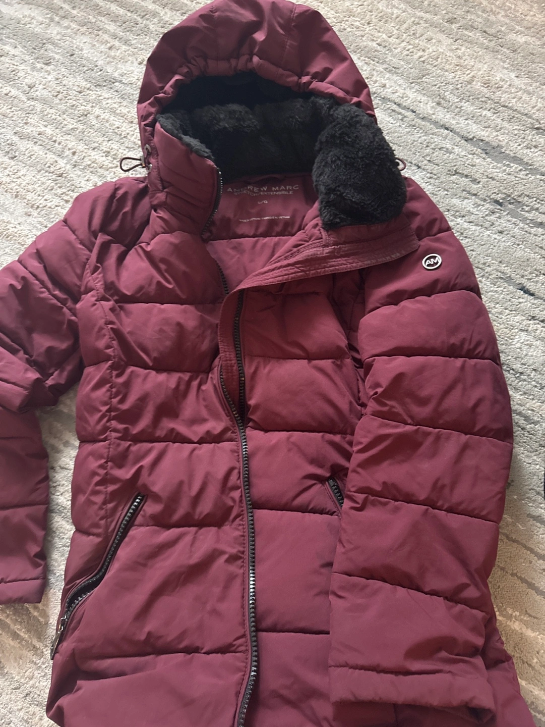 Women's burgundy puffer jacket. Long length, hooded. Features a faux fur lined hood. Zipper closure. Side pockets.