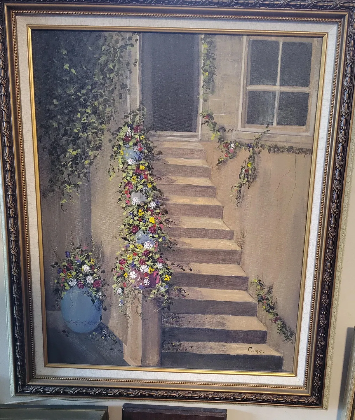 Oil painting depicting a set of steps adorned with colourful flowers. Features a window and doorway in the background, with greenery climbing the wall. Signed 'Olga'.