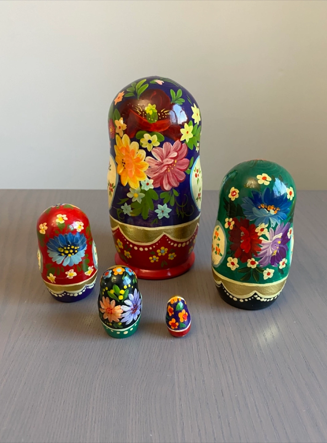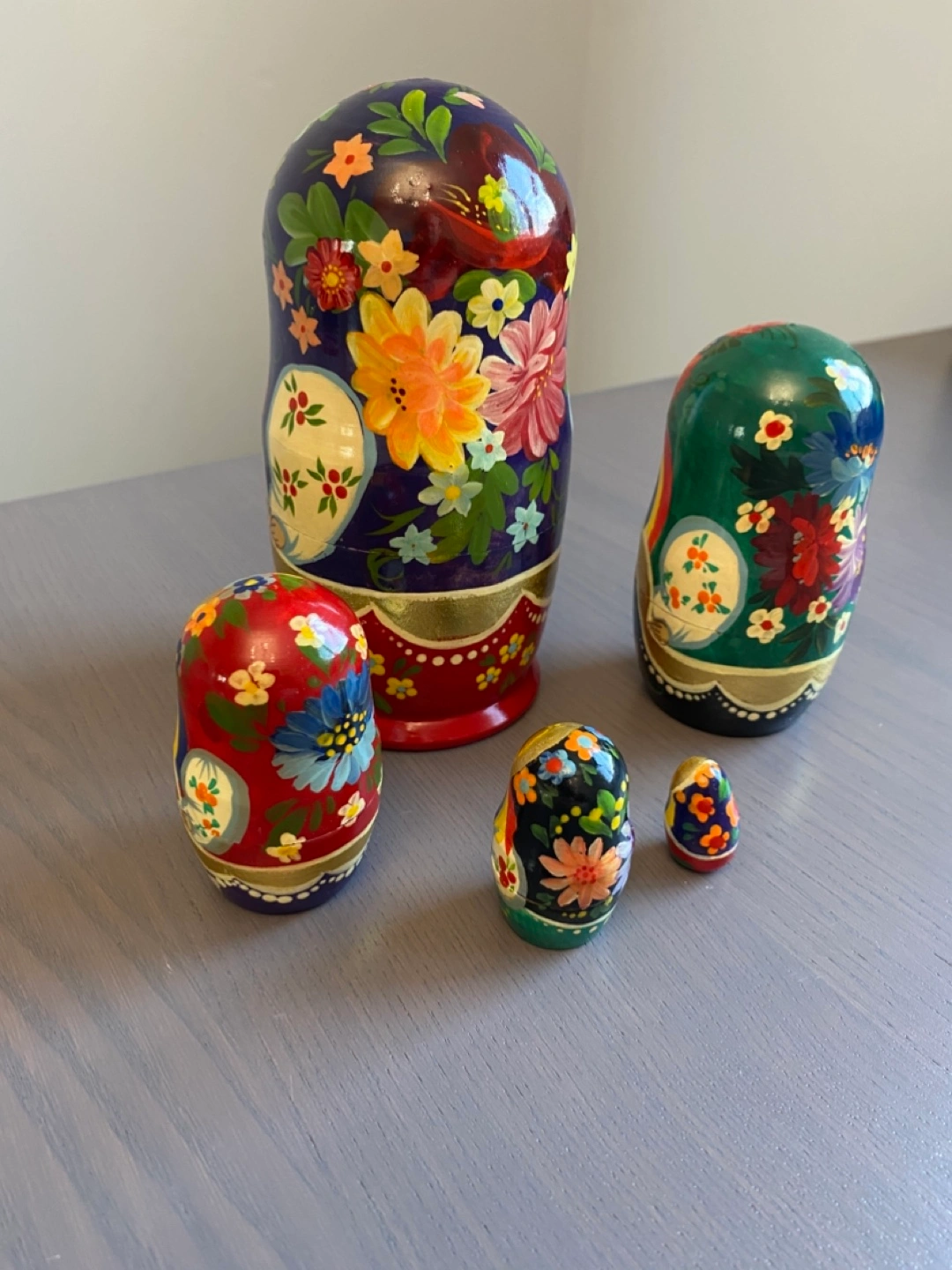 A set of five hand-painted Matryoshka nesting dolls. Each doll features a colourful floral design and a smiling face. They're made of wood and stack inside each other. A lovely decorative piece for your home!