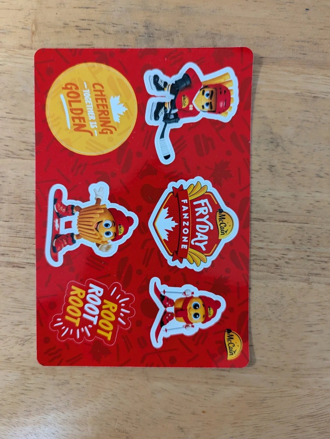 McCain Fryday Fanzone sticker sheet. Features various cartoon fry characters with Canadian maple leaf and hockey themes. Includes 'Cheering Golden' and 'Root Root Root' slogans. Great for decorating notebooks or personal items!