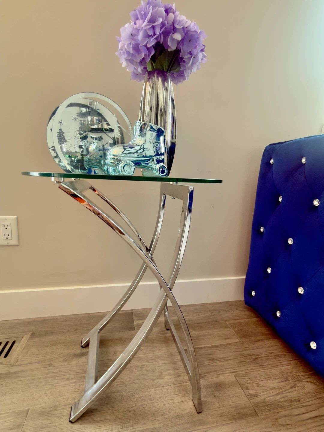 This accent table features a round glass top and a sleek chrome "X" shaped base. It's perfect for displaying decorative items or as a small side table. Measures approximately 20 inches high and 15 inches in diameter.