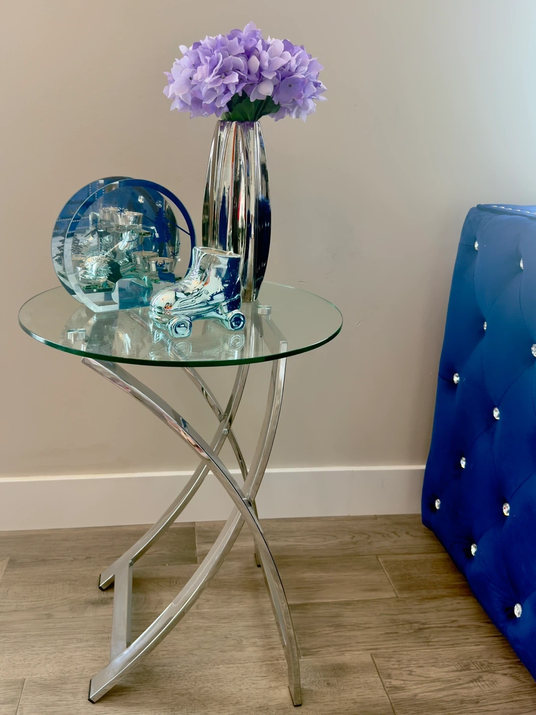 This accent table features a round glass top and a sleek chrome "X" shaped base. It's perfect for displaying decorative items or as a small side table. Measures approximately 20 inches high and 15 inches in diameter.