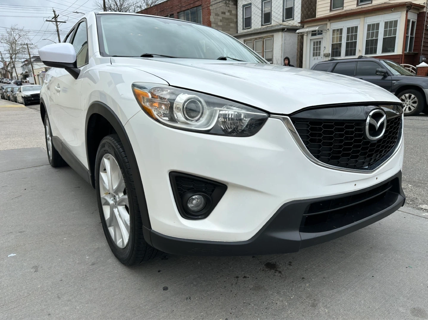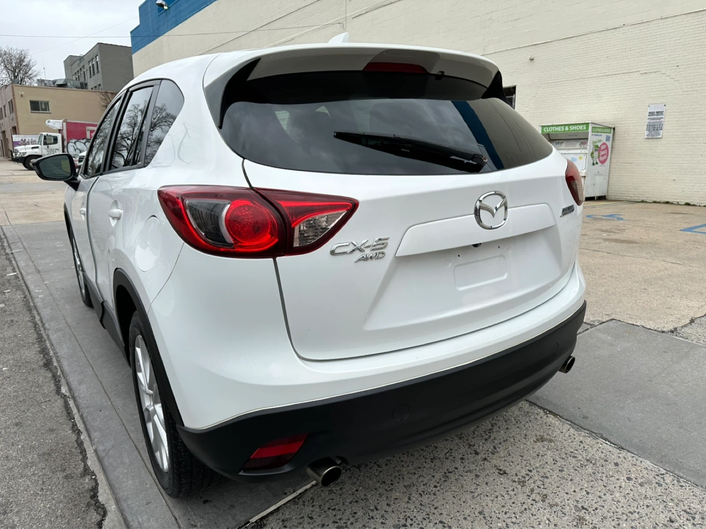This is a white Mazda CX-5 AWD. It's a 4-door SUV with a black interior. Features a smooth-riding suspension.