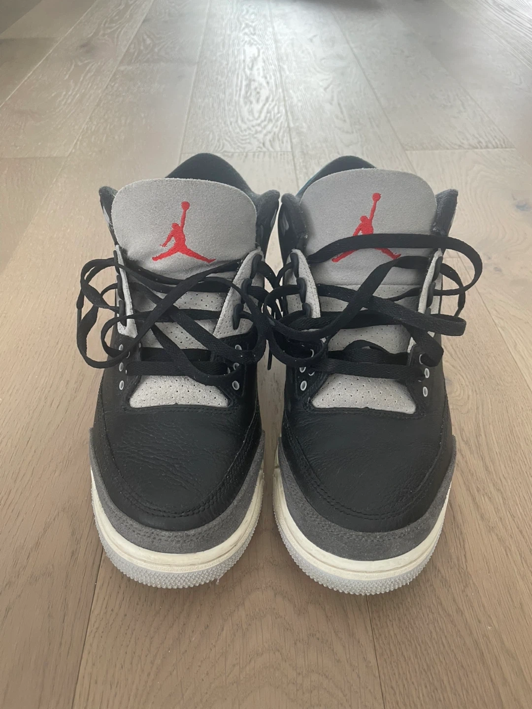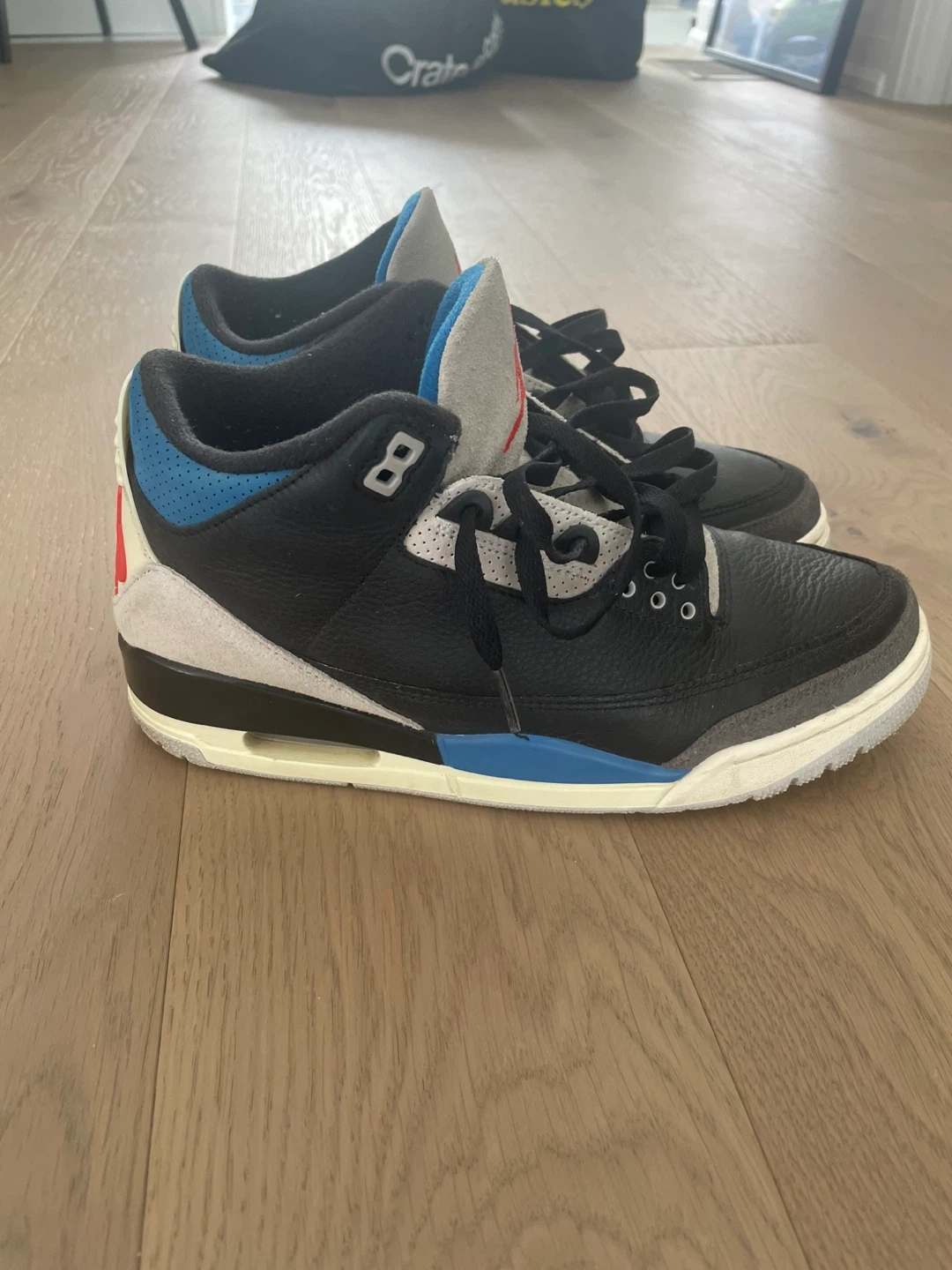 A pair of Nike Air Jordan 3 Retro sneakers. Black leather with grey and blue accents. Features the iconic Jumpman logo and Nike Air branding. Great condition only had these for about 7 months