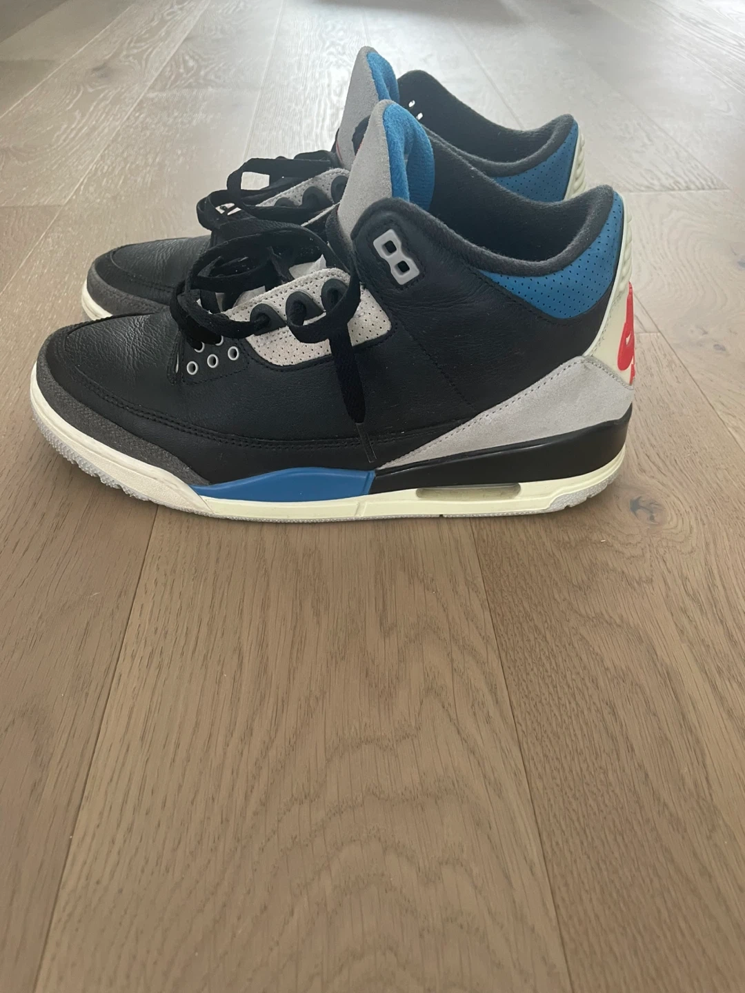 A pair of Nike Air Jordan 3 Retro sneakers. Black leather with grey and blue accents. Features the iconic Jumpman logo and Nike Air branding. Great condition only had these for about 7 months