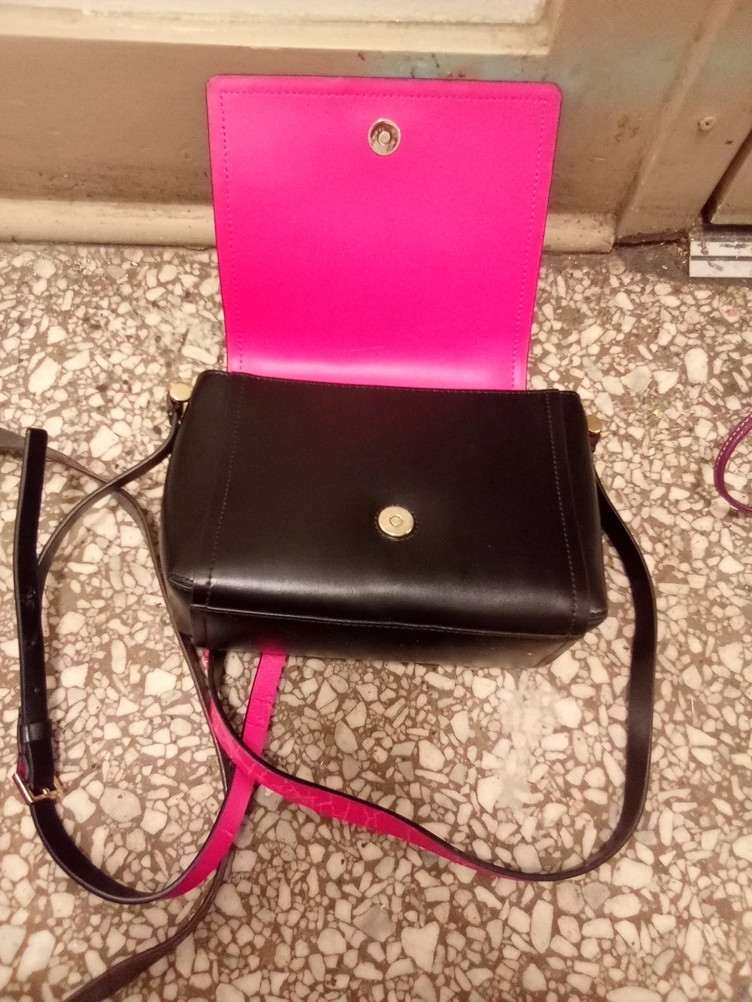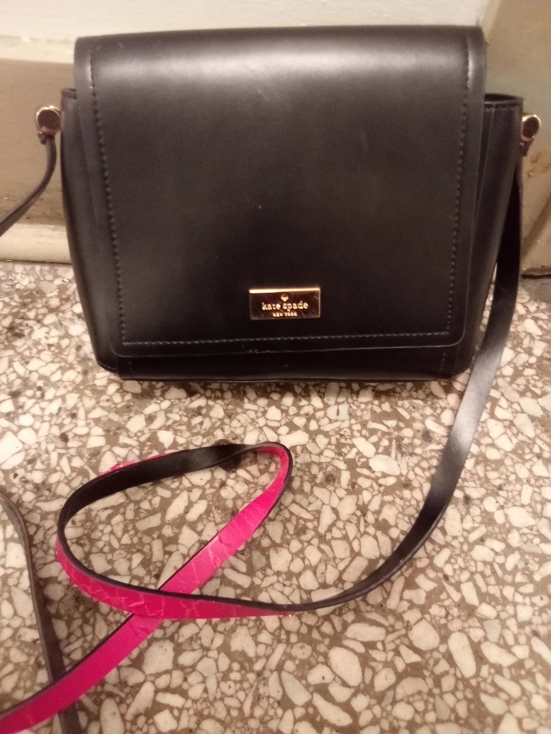 A chic Kate Spade New York crossbody bag in black leather. It features a vibrant pink interior lining and a secure clasp closure. This bag's compact size makes it handy for everyday essentials.