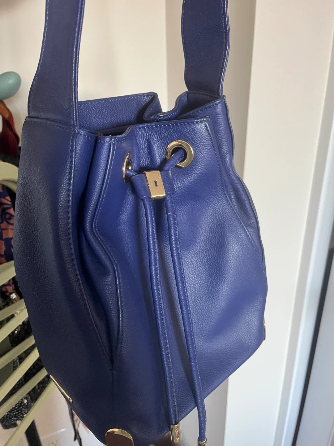 A lovely Vince Camuto handbag in a beautiful shade of blue! It's made of leather and features gold-tone accents. Perfect for adding a pop of colour to your outfit!