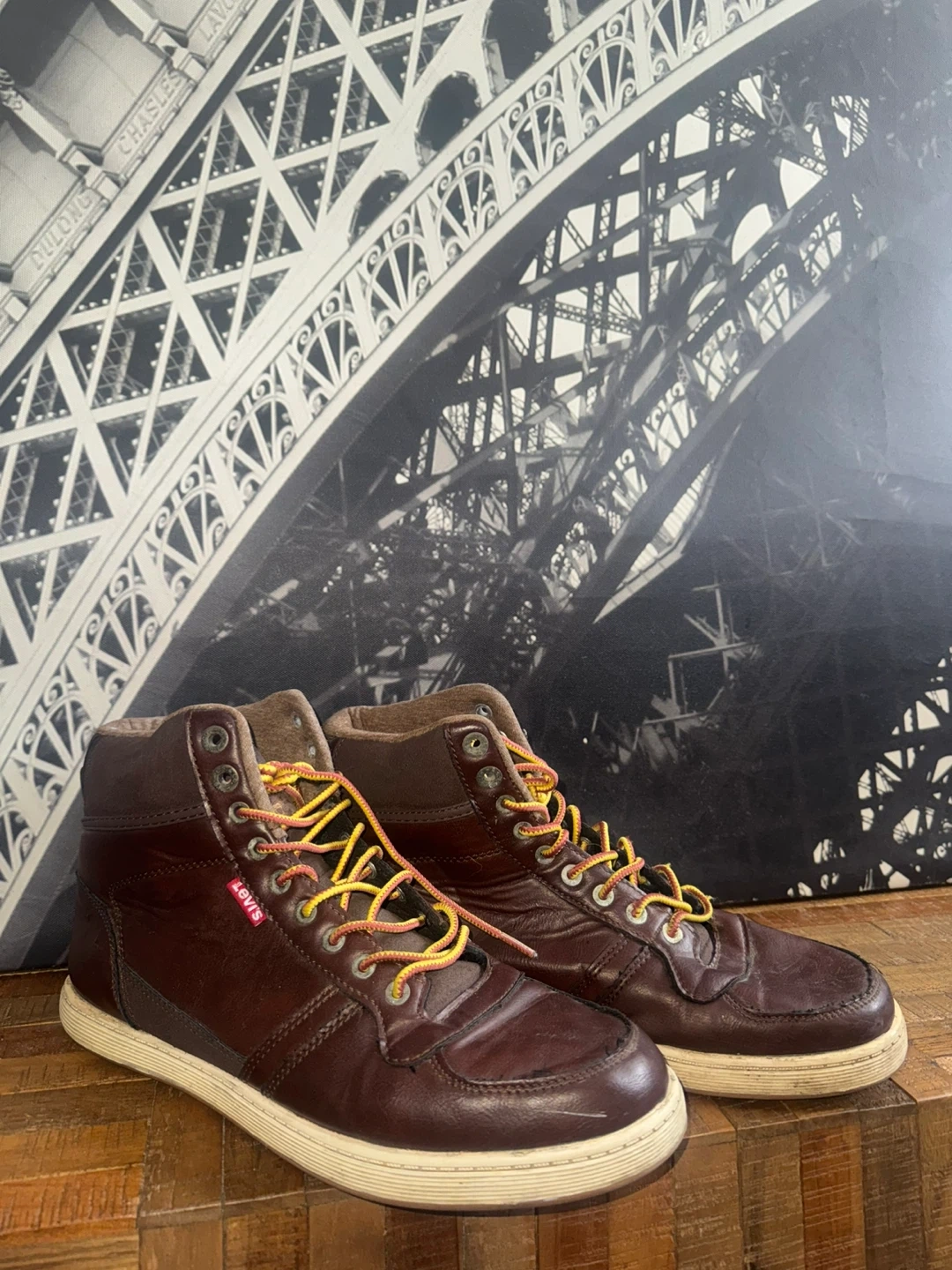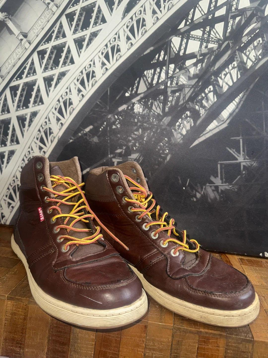 Brown leather Levi's high-top sneakers. Features yellow and red laces. Comfortable for everyday wear. A stylish addition to any casual outfit!