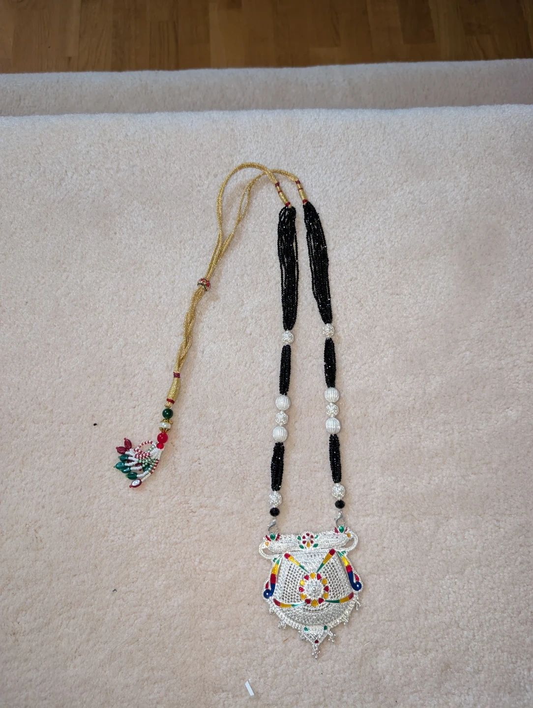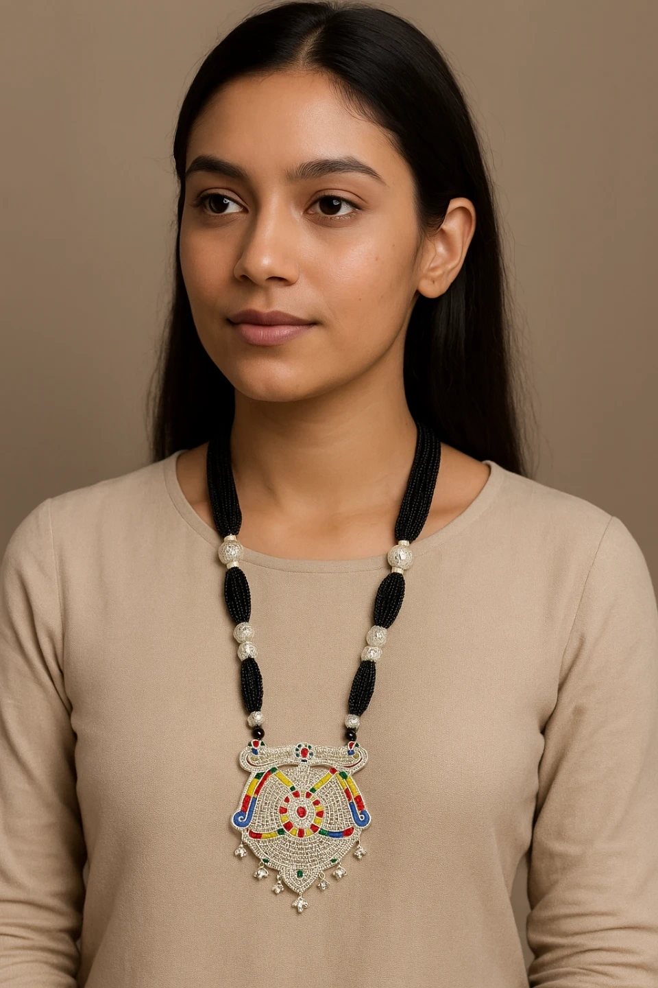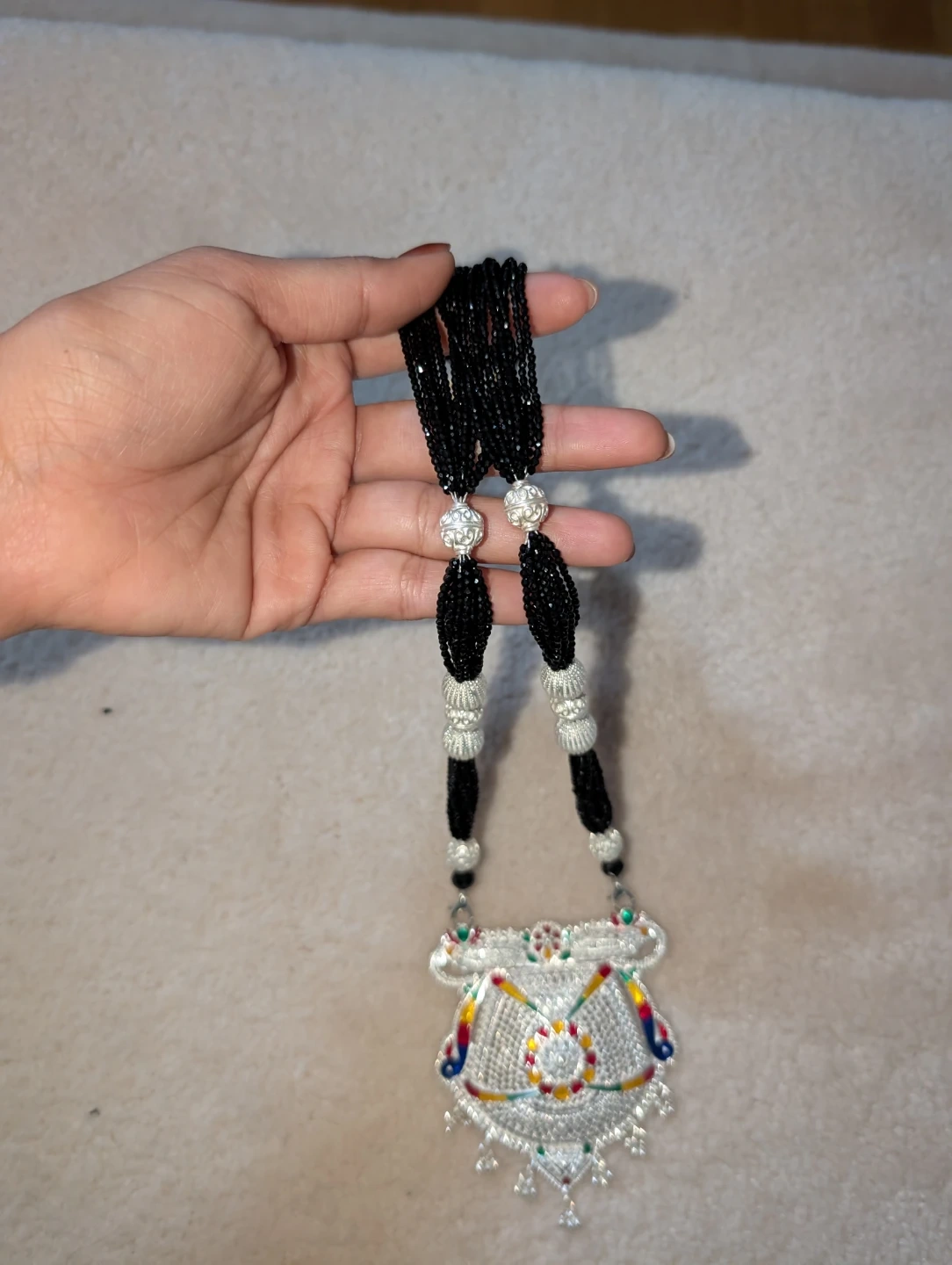 This authentic handcrafted Banjara Rani Haar from Rajasthan is made with pure silver and real black beads, featuring intricate multicolored traditional enamel work.