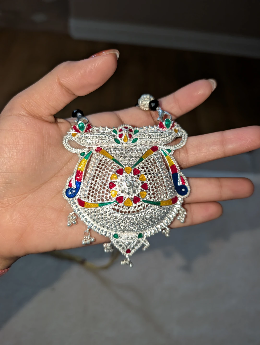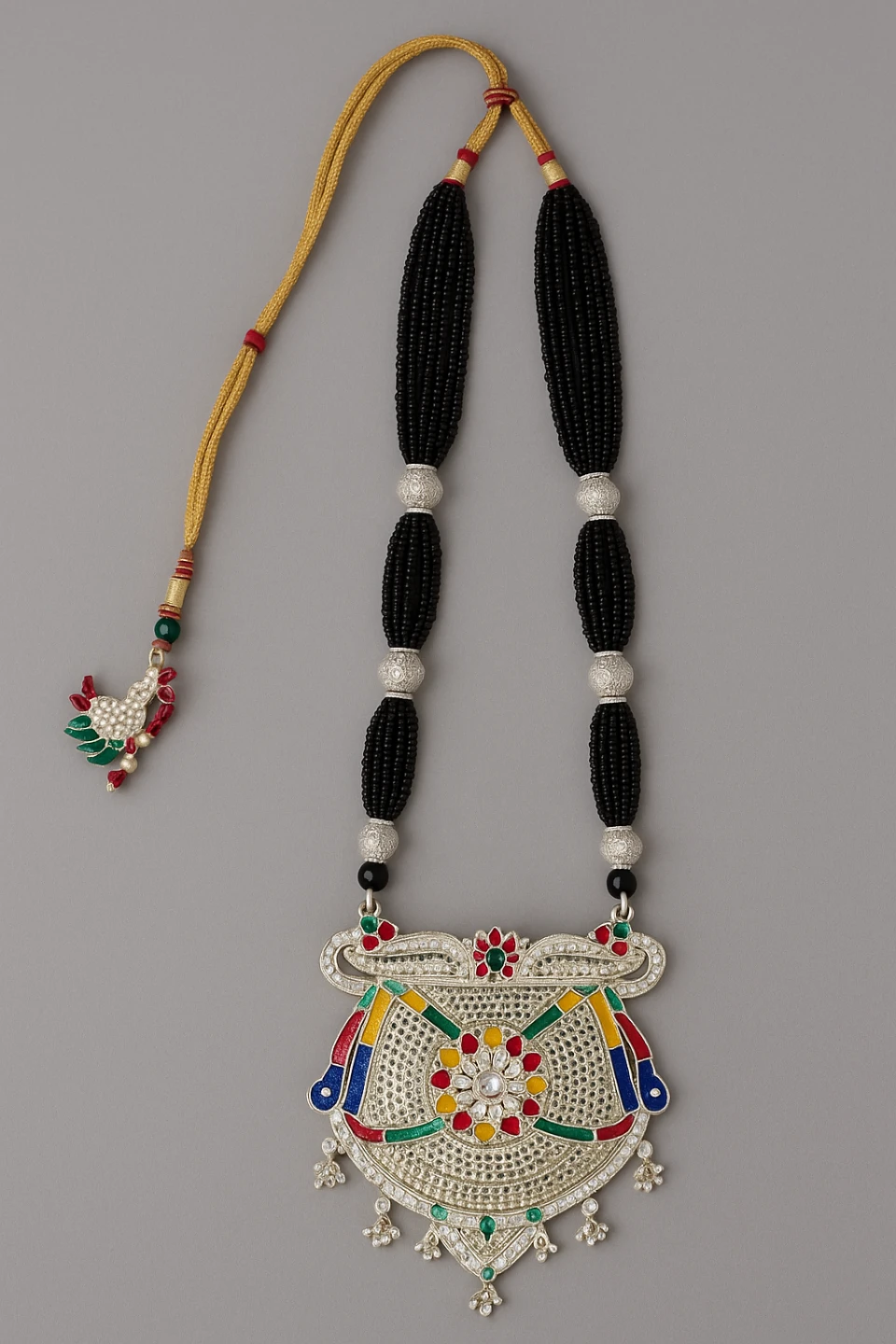 This authentic handcrafted Banjara Rani Haar from Rajasthan is made with pure silver and real black beads, featuring intricate multicolored traditional enamel work.