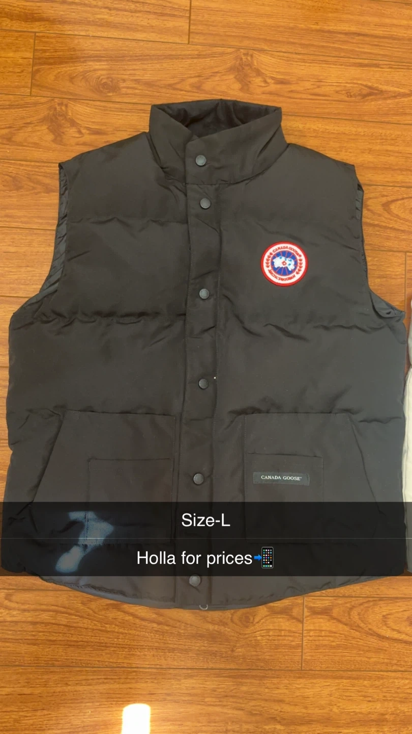 This is a black Canada Goose puffer vest. It's a size large and features the classic Canada Goose patch. The vest has two front pockets and a snap button closure. Msg for delivery information
