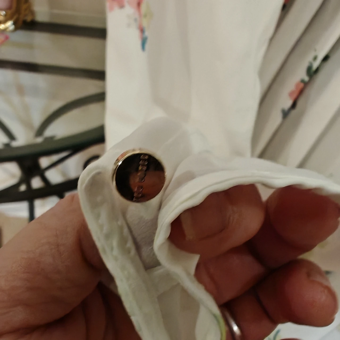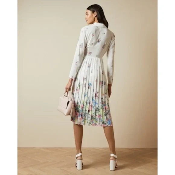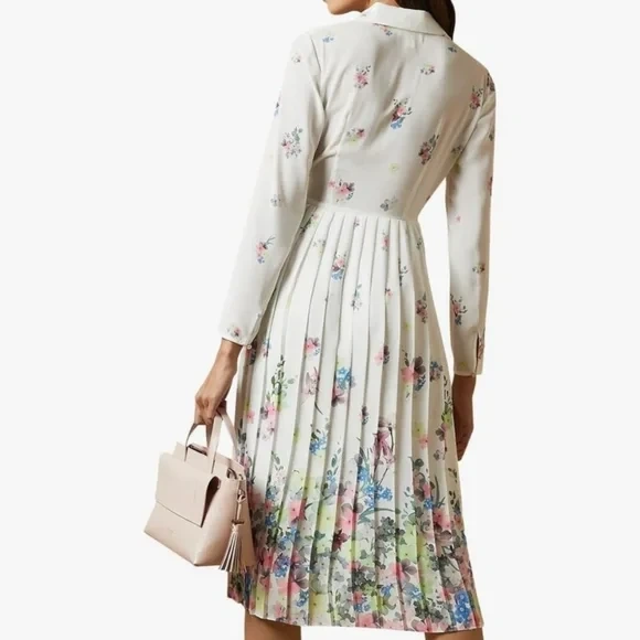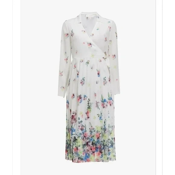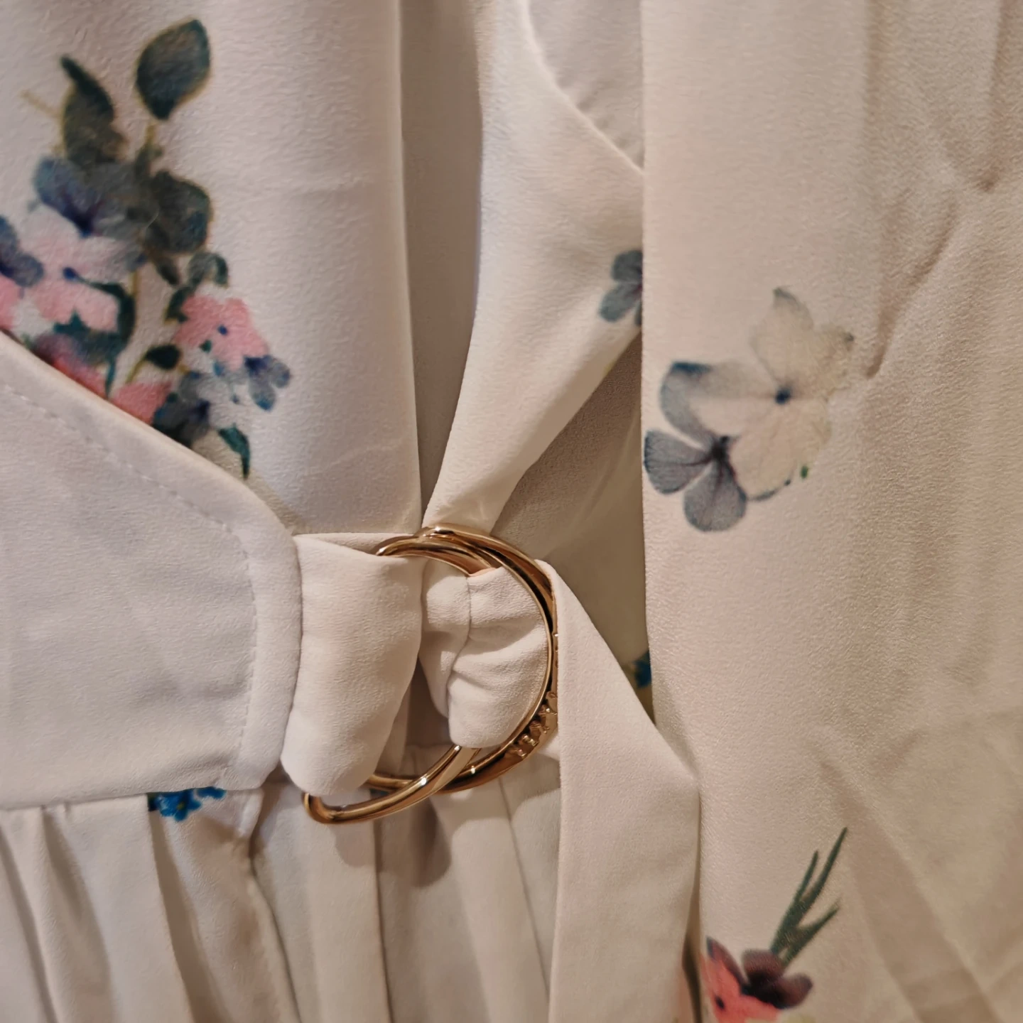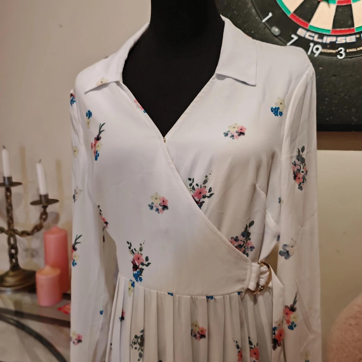 A lovely white midi dress with a vibrant floral print and classic collar. It features a flattering wrap design and elegant pleated skirt. Perfect for spring occasions!