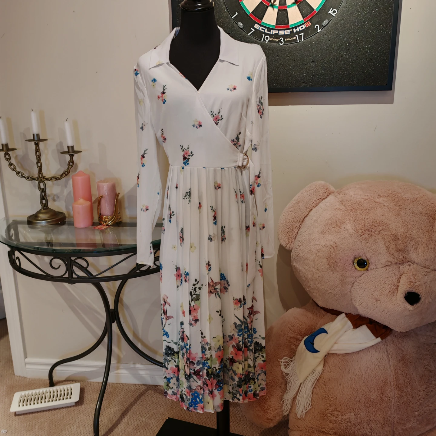 A lovely white midi dress with a vibrant floral print and classic collar. It features a flattering wrap design and elegant pleated skirt. Perfect for spring occasions!