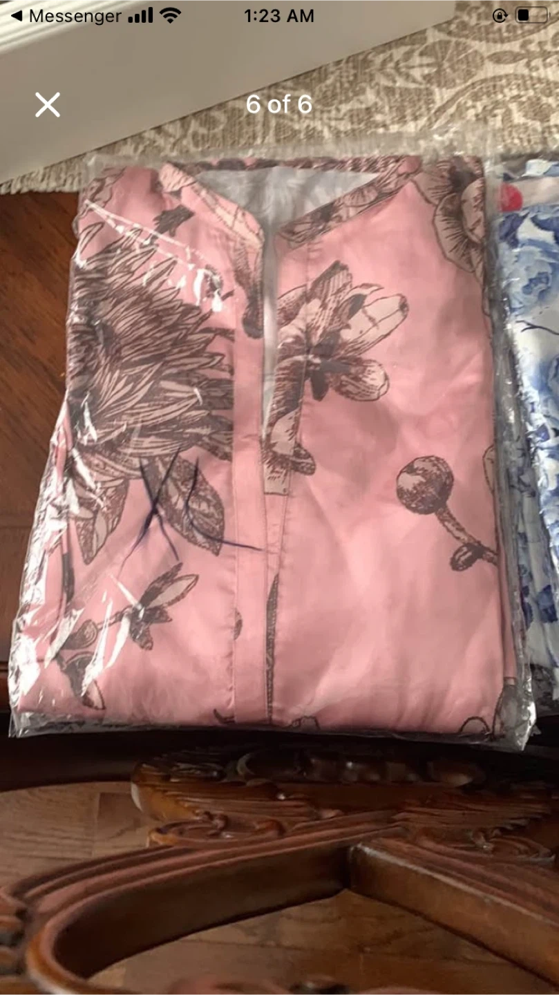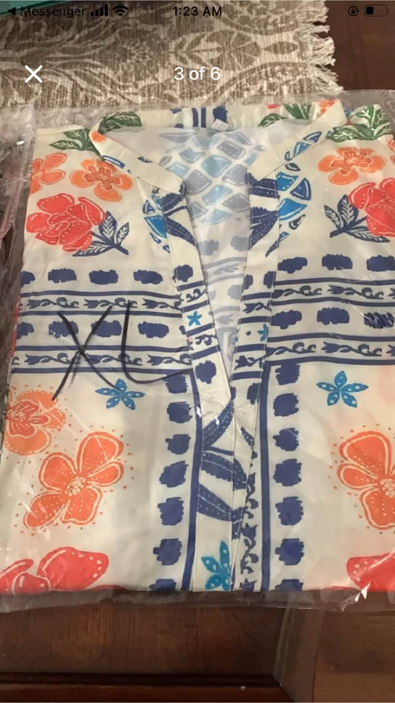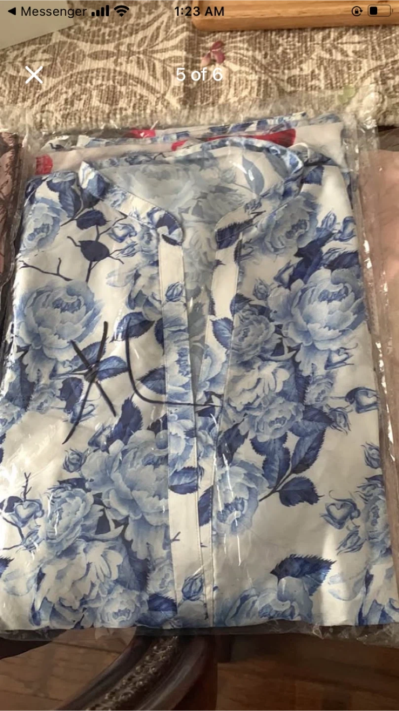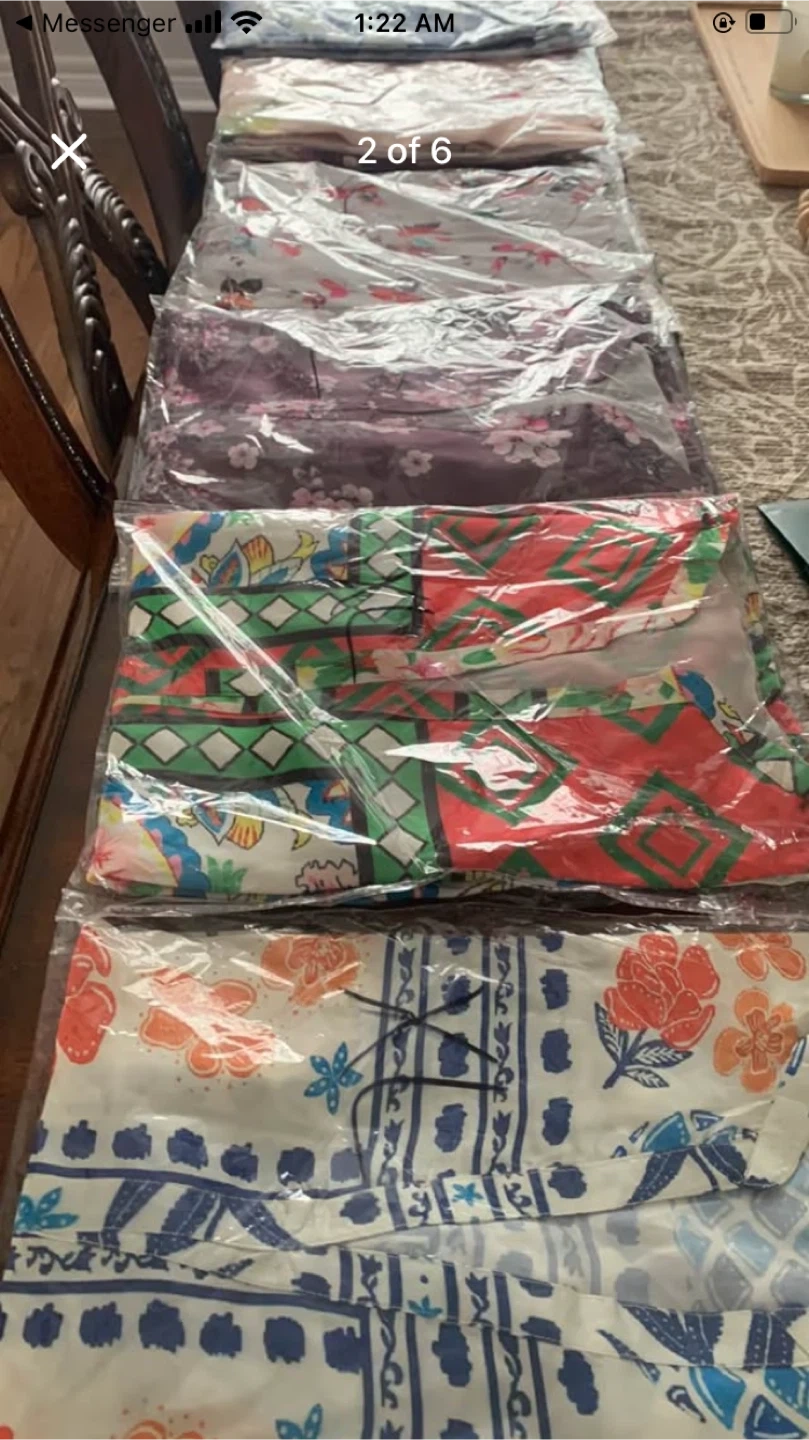 Pack of women's blouses featuring vibrant floral and geometric patterns. Assorted styles and sizes available. Lightweight fabric.