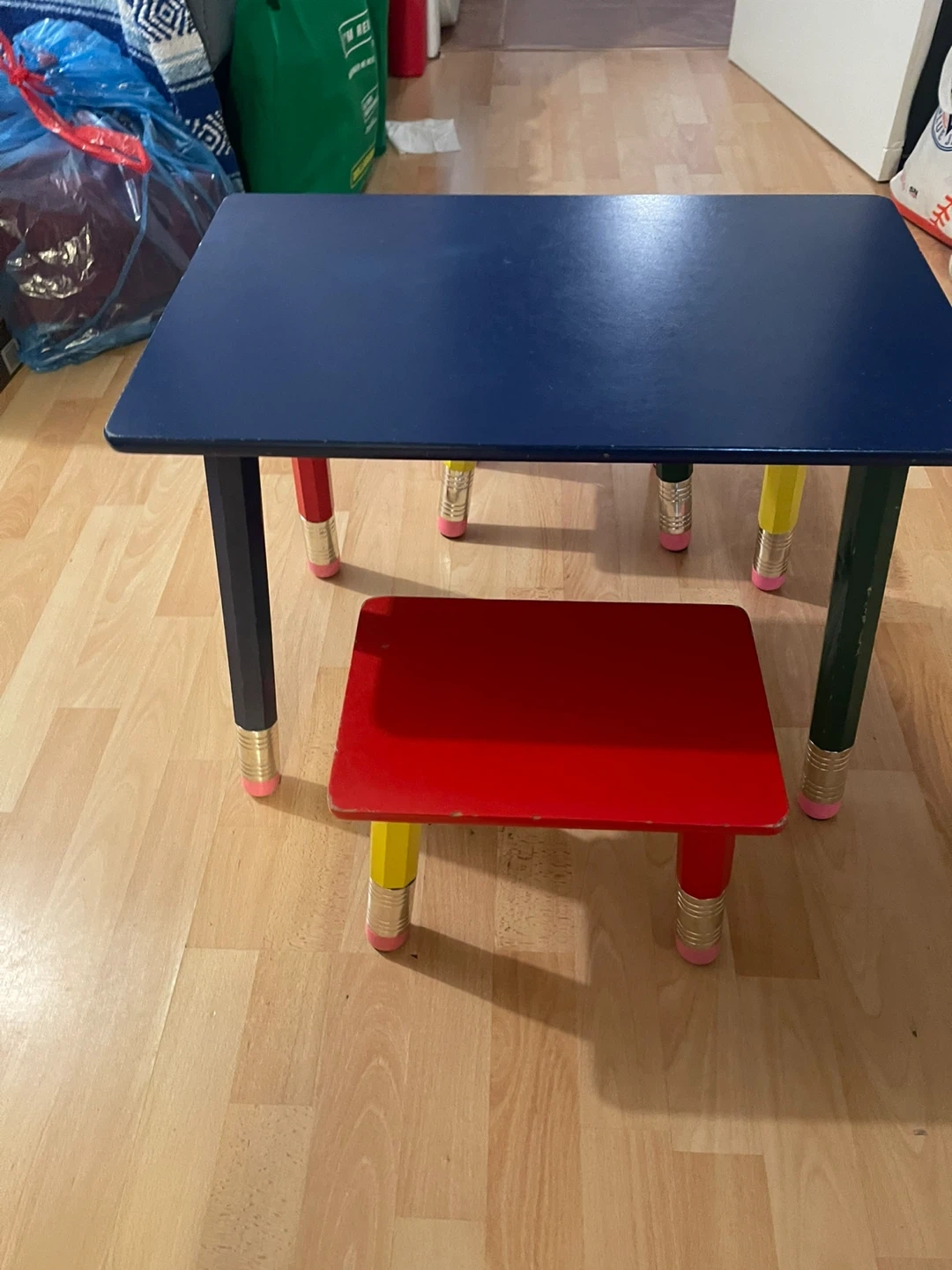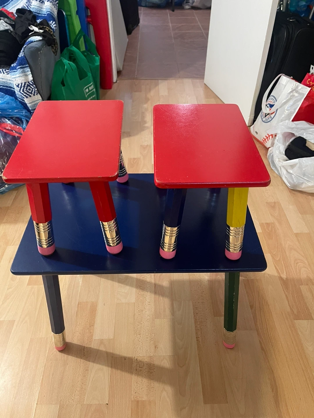 This playful set features a blue table and two red chairs, all designed with unique pencil-shaped legs. It's a fun addition to a child's room or play area. The table and chairs are made of sturdy wood for durability. Perfect for crafts, homework, or snack time!