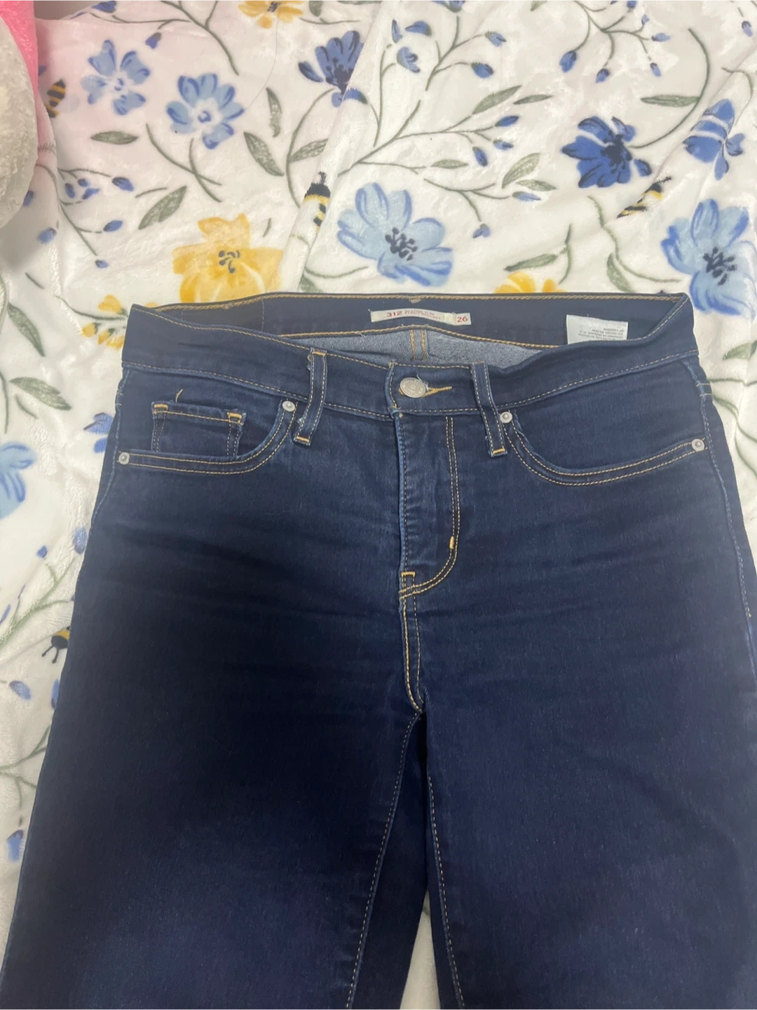 Classic dark wash Levi's jeans for women. Features a size 26 waist. These jeans offer a comfortable fit for everyday wear. Denim material.