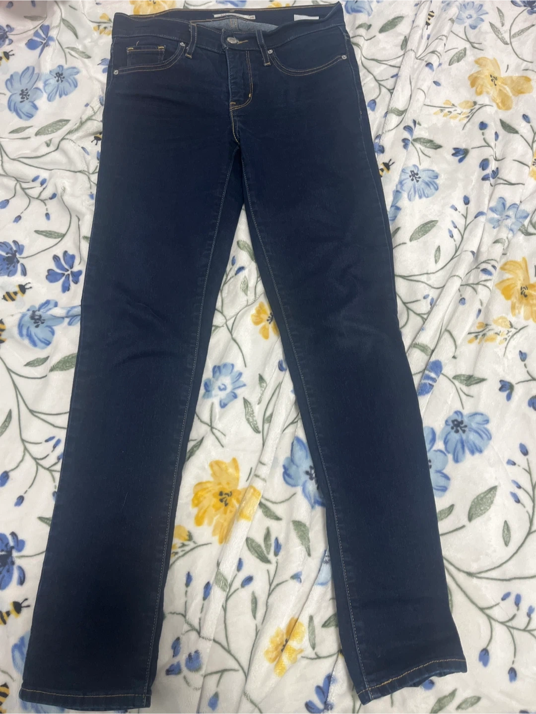 Classic dark wash Levi's jeans for women. Features a size 26 waist. These jeans offer a comfortable fit for everyday wear. Denim material.