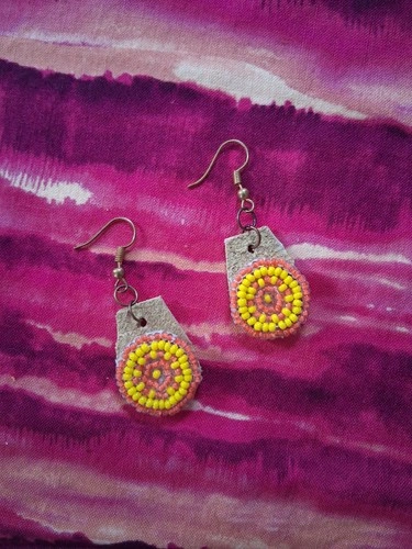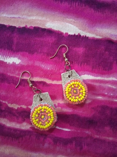 Elevate your accessory game with these Mini Beaded Earrings, showcasing a vibrant blend of orange and yellow hues. These earrings have a Native American ethnic flair, crafted with meticulous attention to detail. The combination of yellow main stone color and leather material creates a warm, earthy aesthetic that complements any outfit. Delicately styled with a beaded design, these earrings offer a subtle yet striking touch to your jewelry collection. They're perfect for adding a splash of color and cultural richness to both everyday wear and special occasions. This piece is handmade by Indigenous artist Achilles Peloquin.