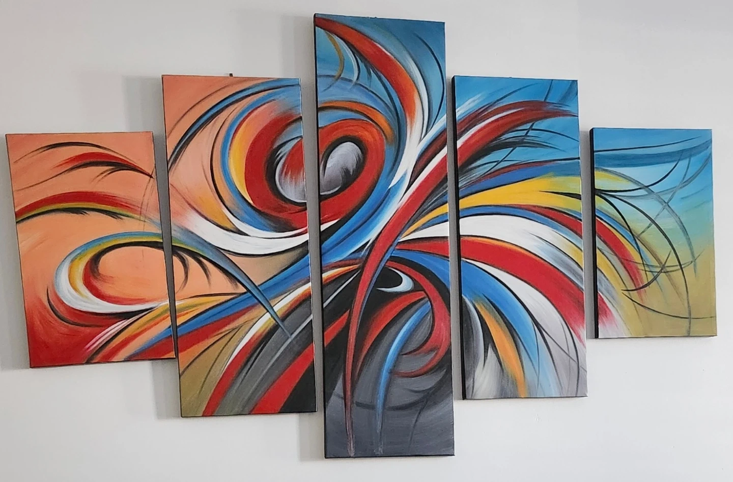 This vibrant 5-piece canvas art set features an abstract design with bold strokes of red, blue, yellow, and orange. The paintings are on canvas. It's a great way to add a splash of colour to any room!