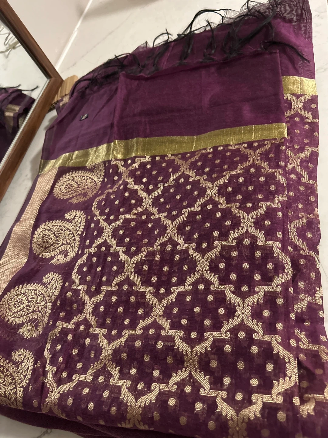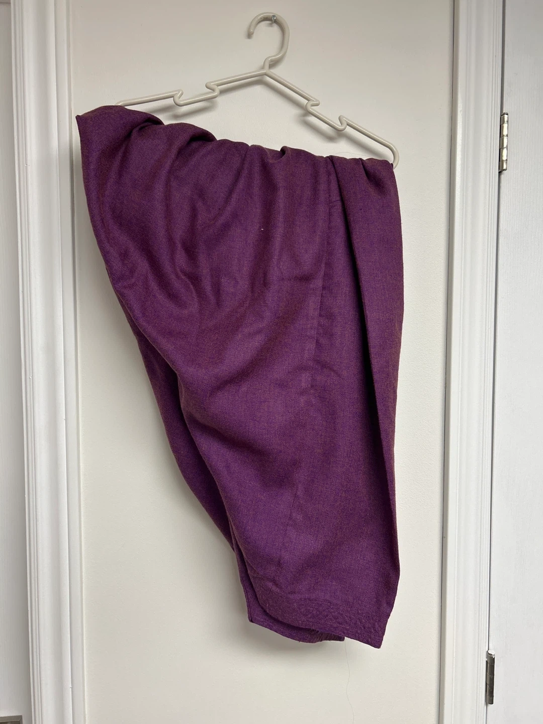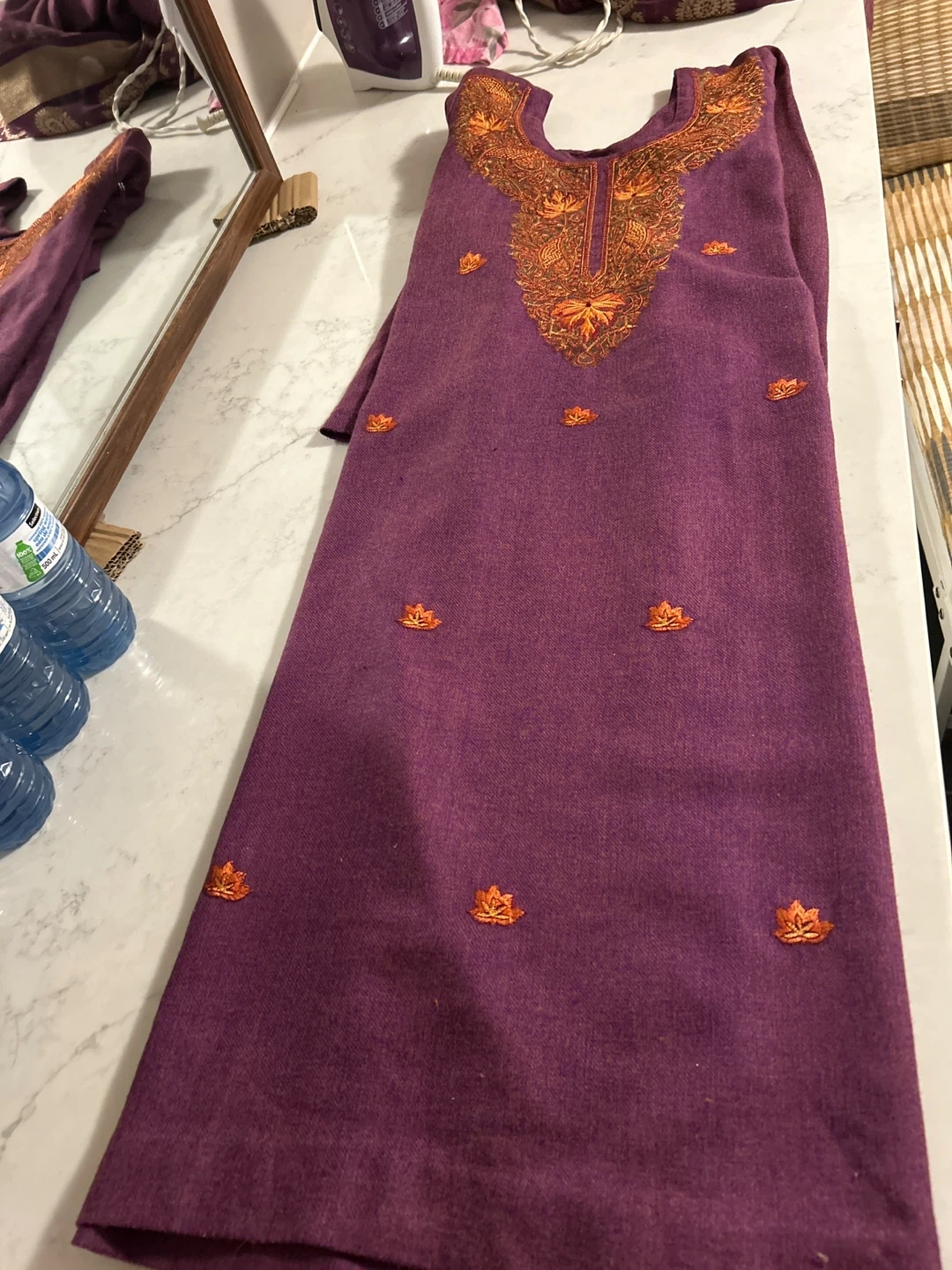 Beautiful purple embroidered kurti with matching pants. The kurti features intricate orange embroidery around the neckline and scattered floral motifs. Pants are plain with a textured hem. This ensemble is perfect for special occasions or festive wear!qameez length 39.5 trouser length 35 with full fancy dopatta .it is warm stuff.
