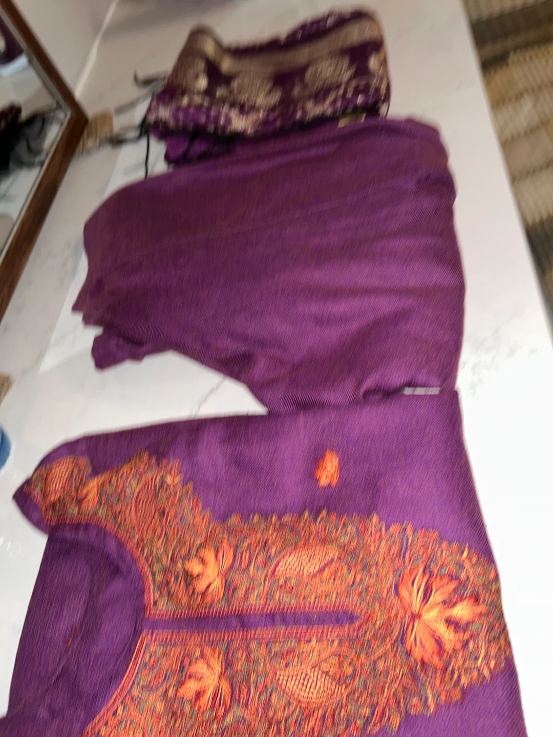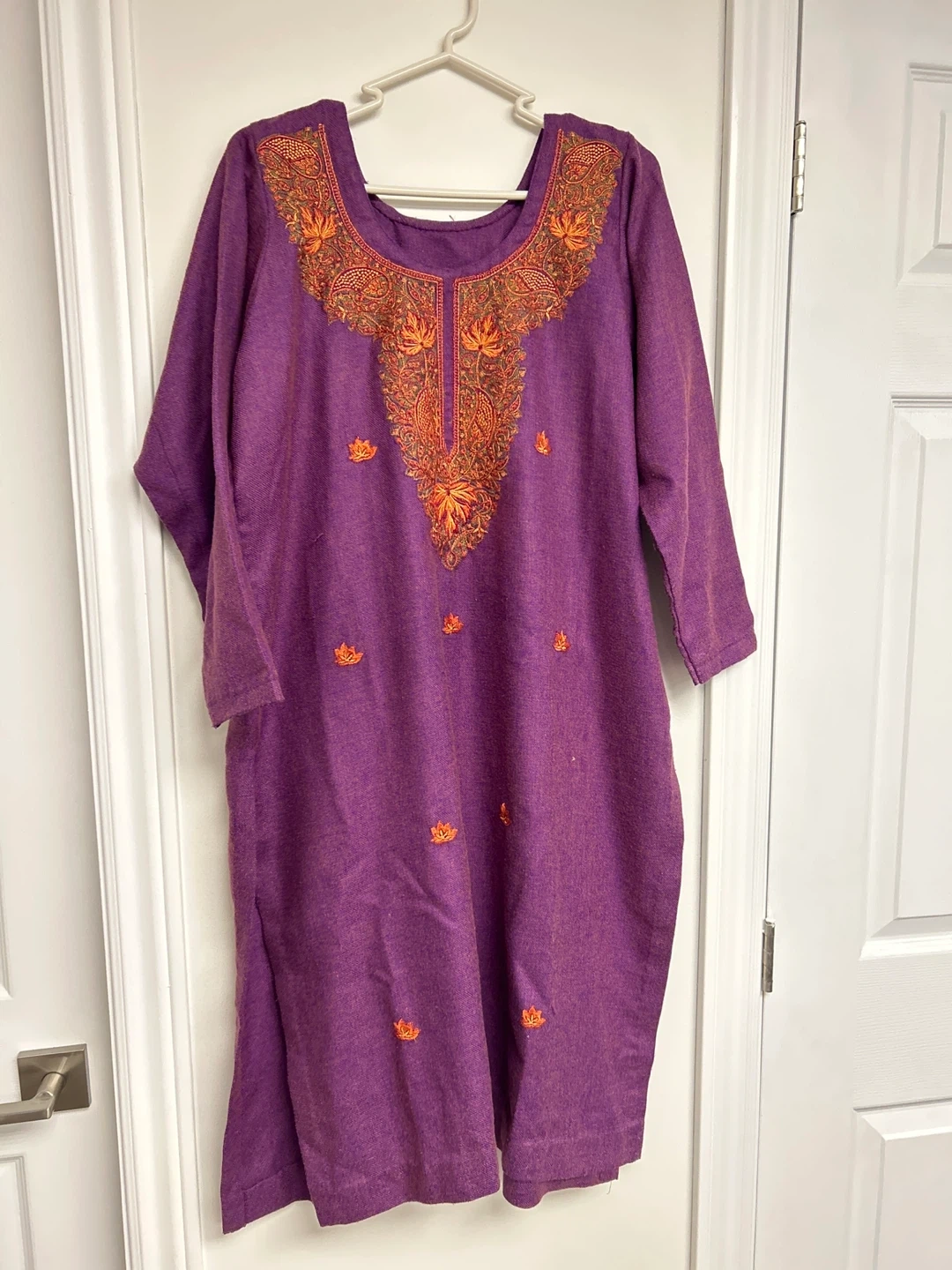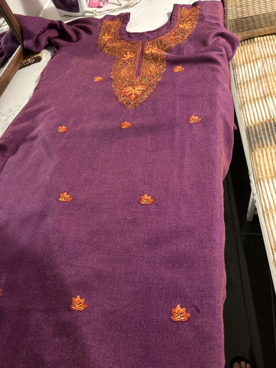 Beautiful purple embroidered kurti with matching pants. The kurti features intricate orange embroidery around the neckline and scattered floral motifs. Pants are plain with a textured hem. This ensemble is perfect for special occasions or festive wear!qameez length 39.5 trouser length 35 with full fancy dopatta .it is warm stuff.