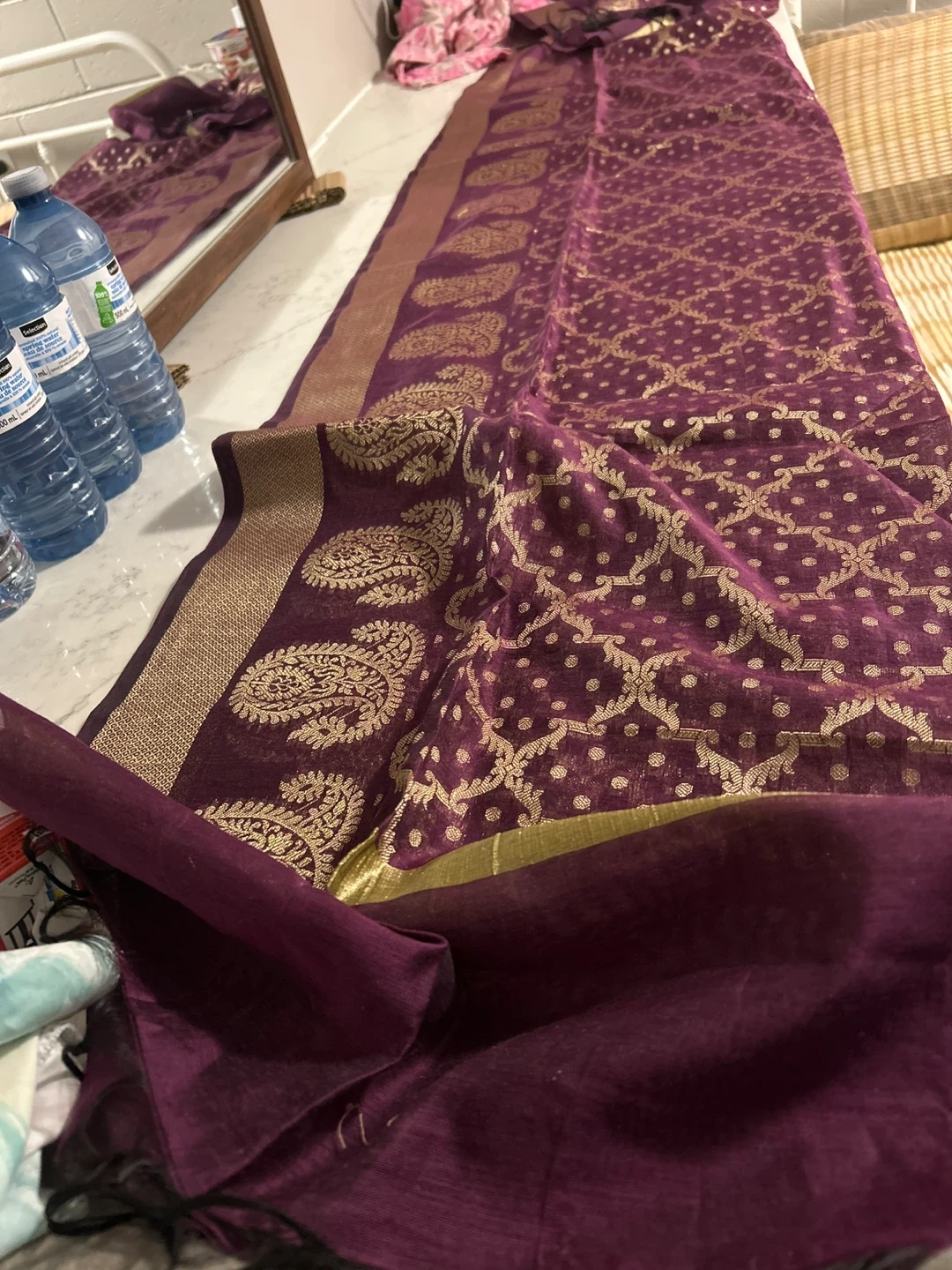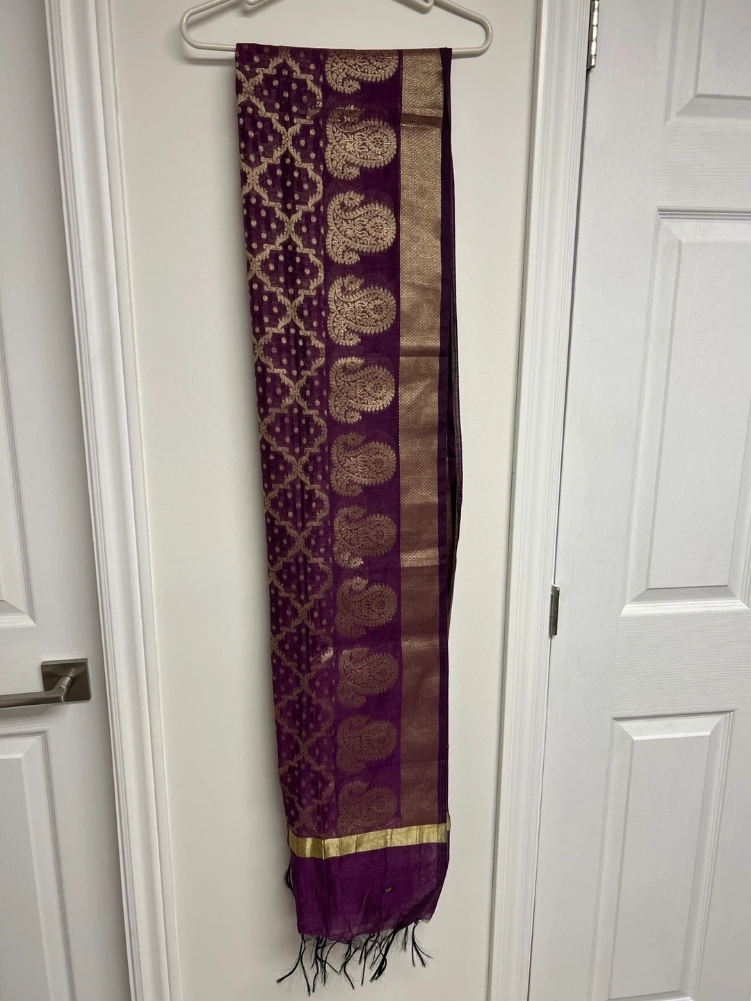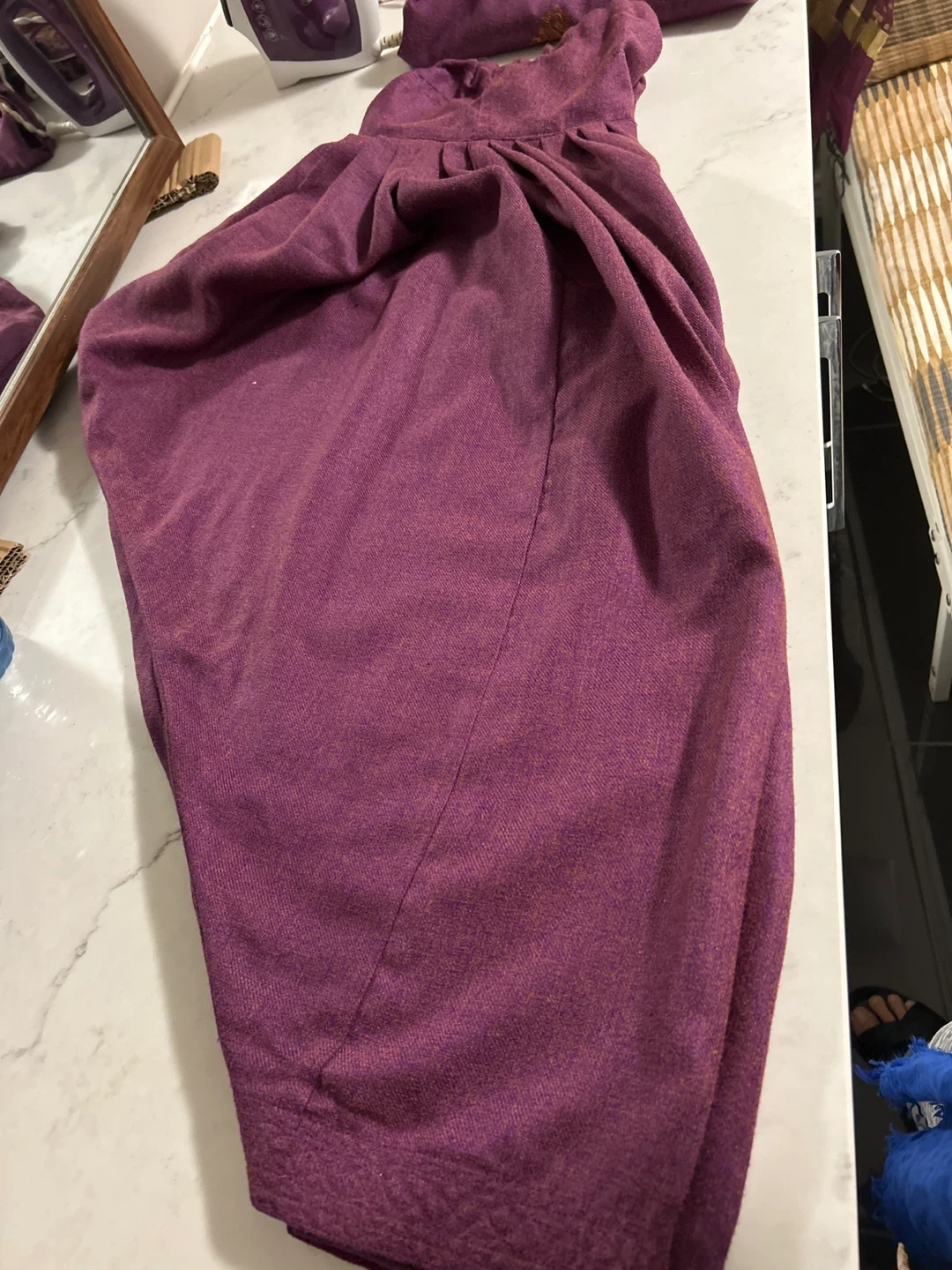 Beautiful purple embroidered kurti with matching pants. The kurti features intricate orange embroidery around the neckline and scattered floral motifs. Pants are plain with a textured hem. This ensemble is perfect for special occasions or festive wear!qameez length 39.5 trouser length 35 with full fancy dopatta .it is warm stuff.