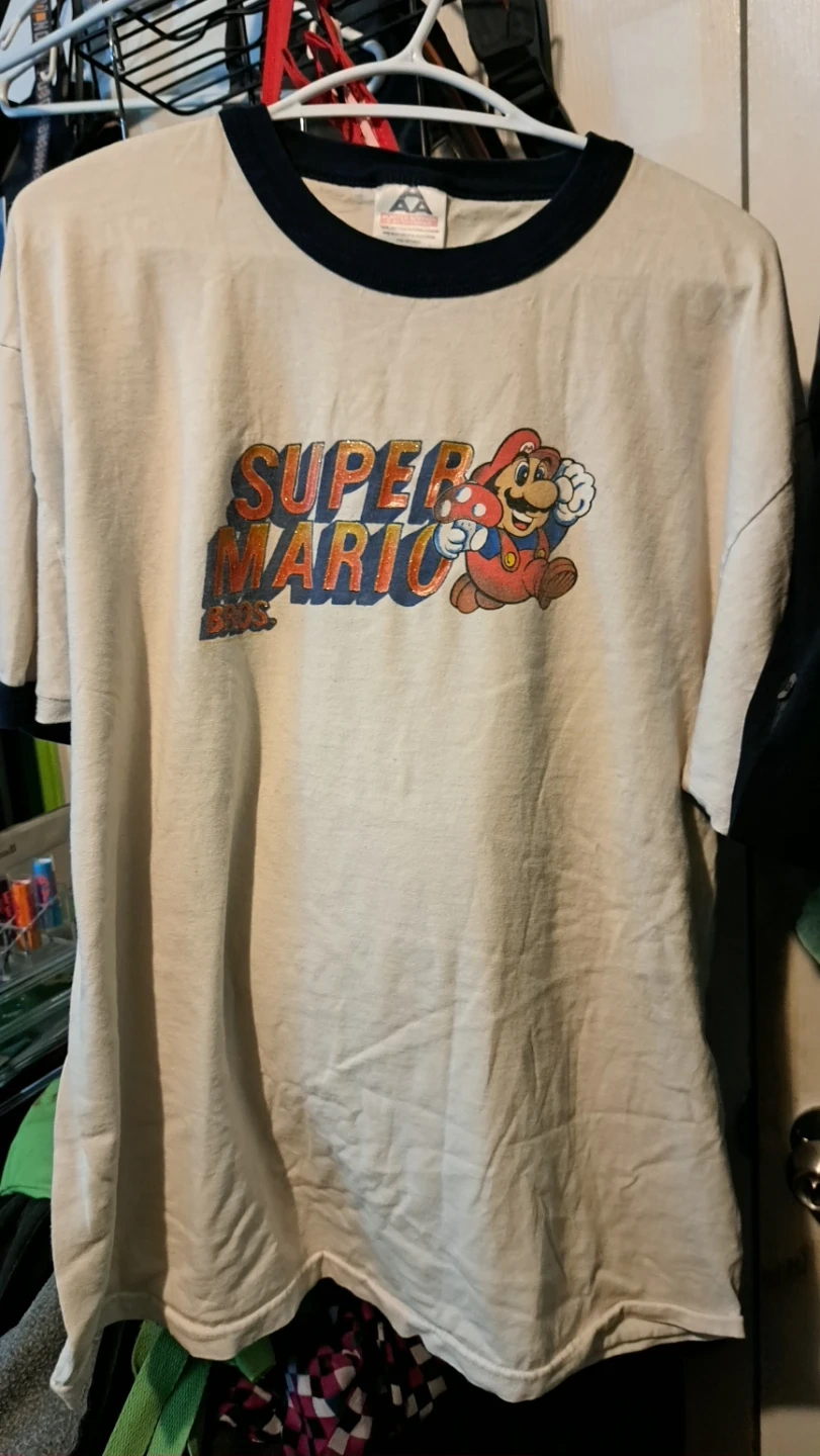 Cream-coloured ringer t-shirt with a Super Mario Bros. graphic print. It's 100% pre-shrunk cotton and size XL. Made in Mexico from fabric made in the USA.