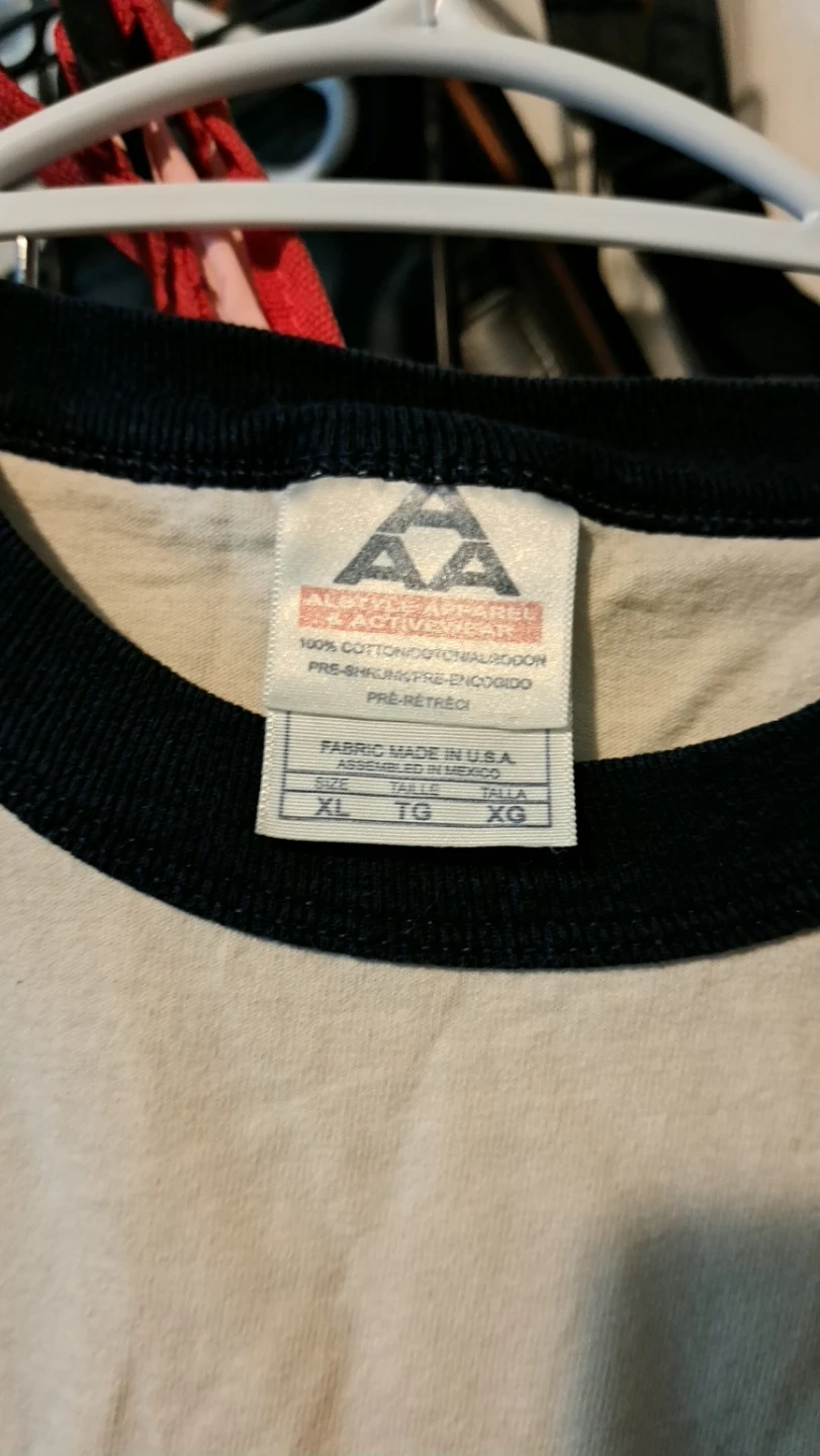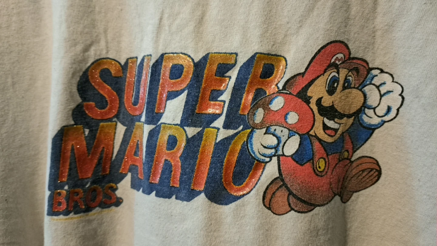 Cream-coloured ringer t-shirt with a Super Mario Bros. graphic print. It's 100% pre-shrunk cotton and size XL. Made in Mexico from fabric made in the USA.