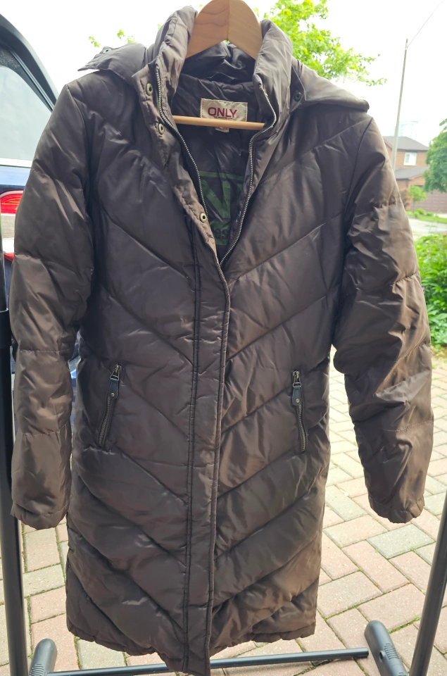 A brown puffer jacket, very warm. Full-length with a hood, also including a zipper. There are pockets as well, perfect for keeping your hands warm on a chilly day.
