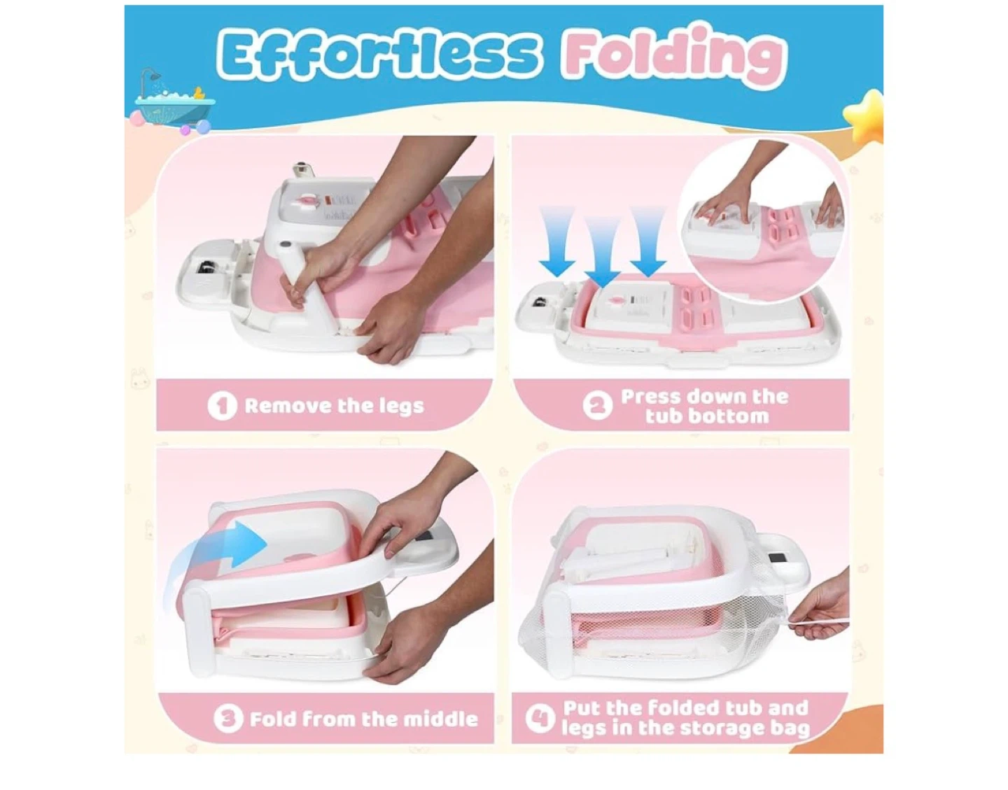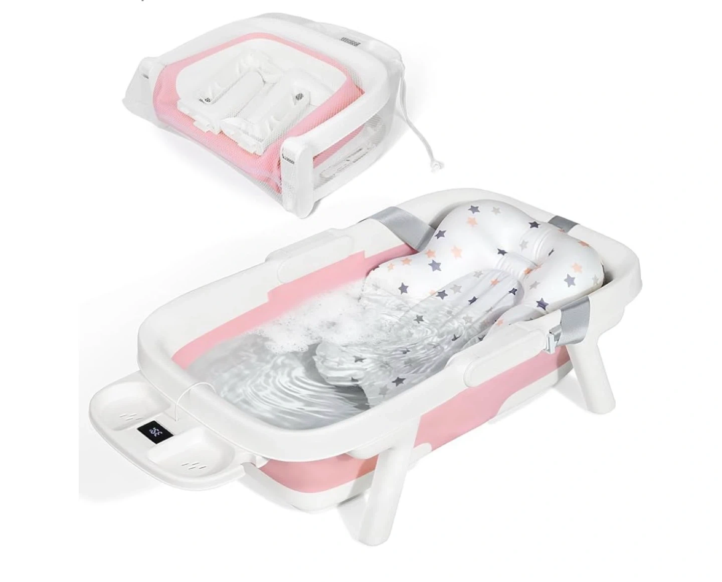 Pink Foldable Baby Bathtub with Thermometer and Bath Mat