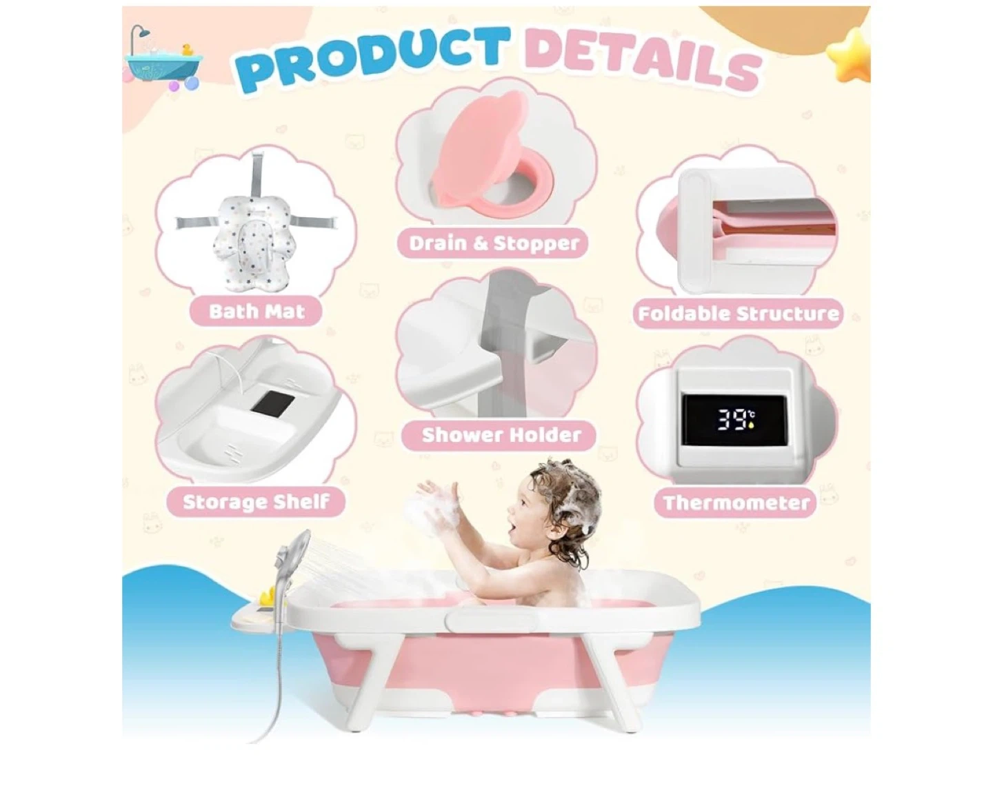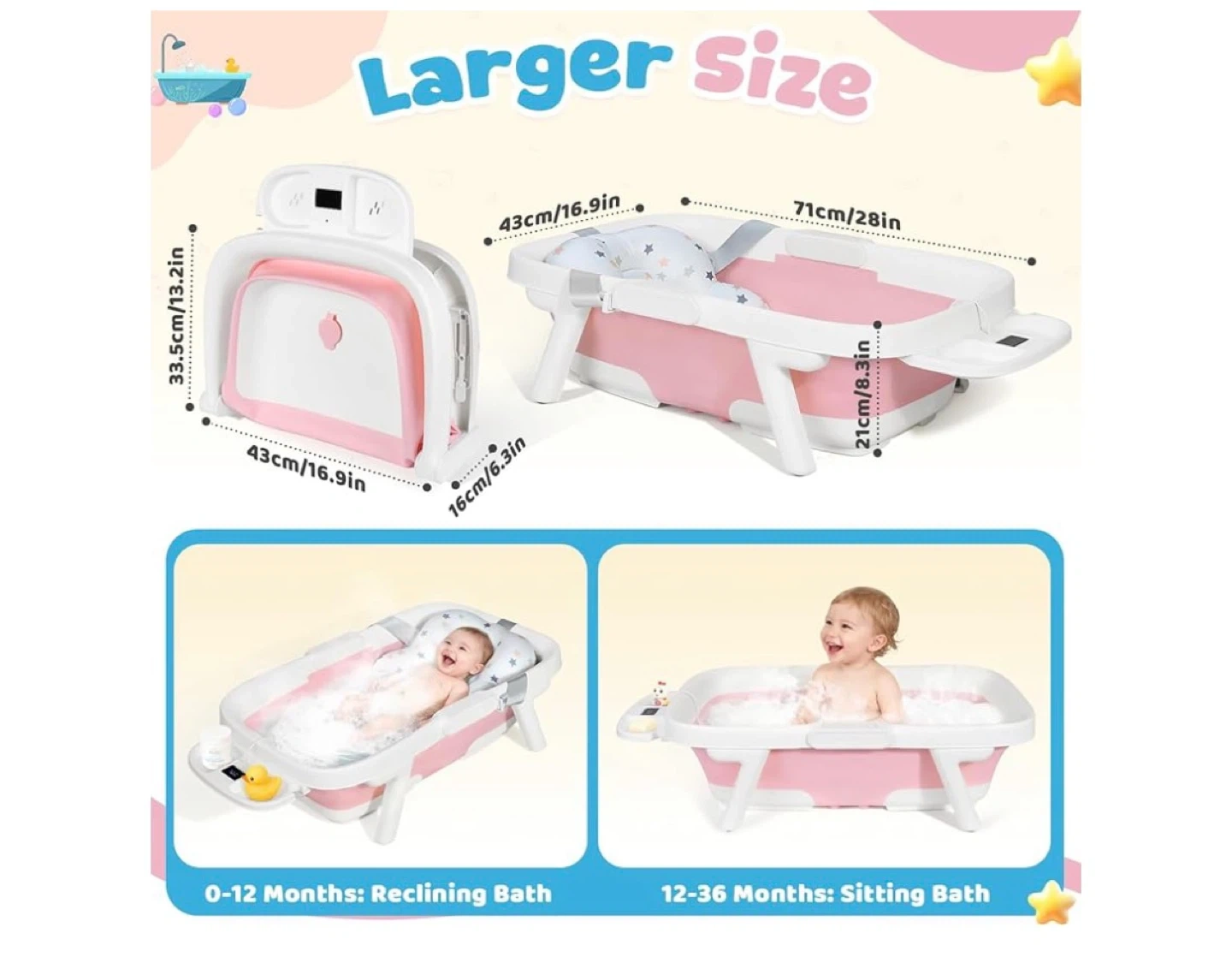 This pink foldable baby bathtub features a built-in thermometer for safe bathing temperatures. It's designed for effortless folding and includes a bath mat and storage shelf. The bathtub can be used as a reclining bath for infants 0-12 months and a sitting bath for toddlers 12-36 months.