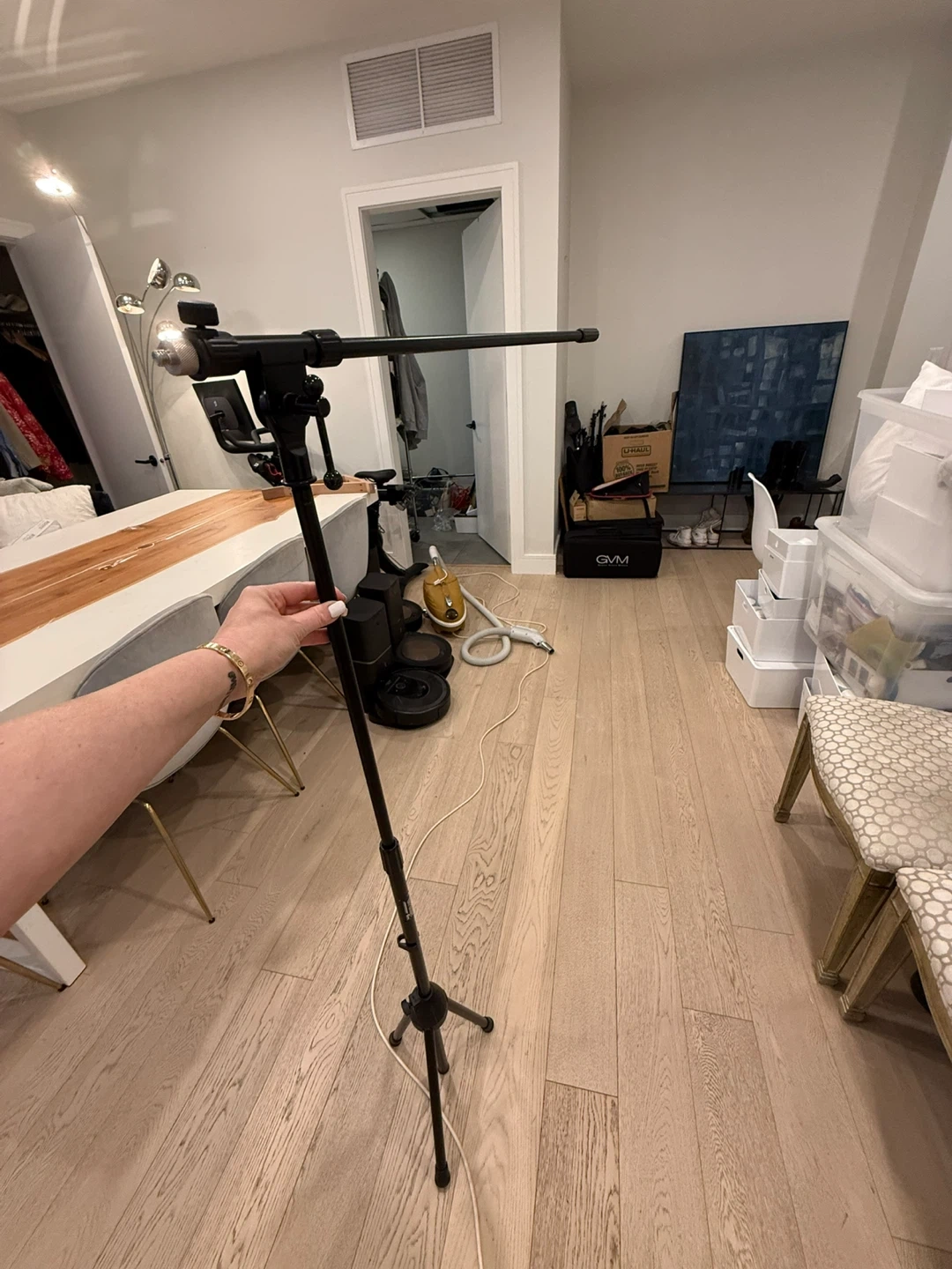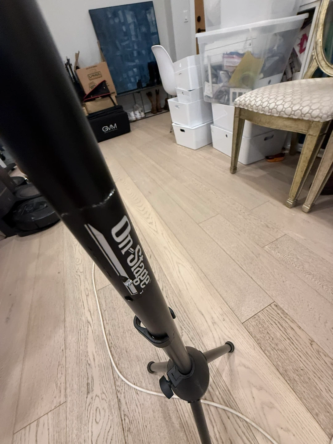 This is an On-Stage microphone stand. It's a sturdy tripod base with an adjustable height boom arm. The stand is made of metal.