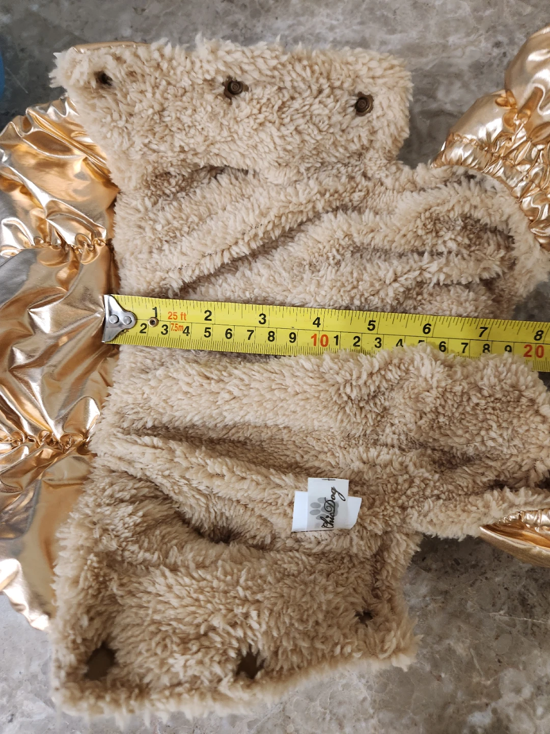 Snuggly and stylish gold padded dog coat! It's in great condition and will keep your furry friend warm and cozy. Perfect for small dogs. Back length 20 cm