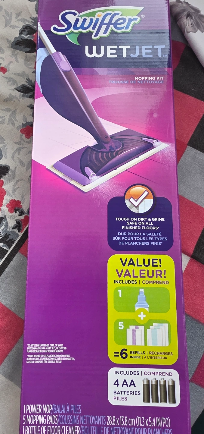 New Swiffer WetJet mopping kit. Includes power mop, five cleaning pads, one bottle of cleaner, and four AA batteries. Great for cleaning various floor types.