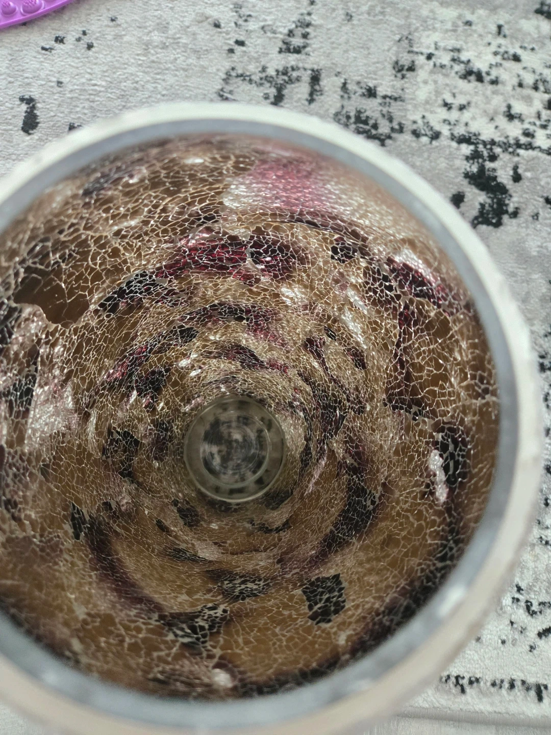 Decorative mosaic vase with a crackle glass finish. Gold, black, and white tones. Interior has a subtle purple hue. It's approximately 12 inches tall and 5 inches wide at its widest point. Beautiful accent piece for any room!