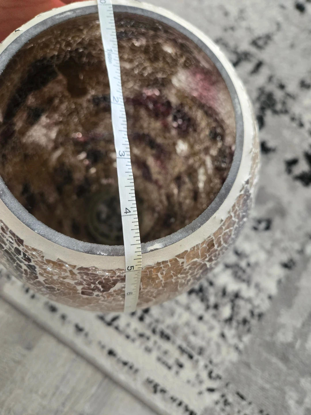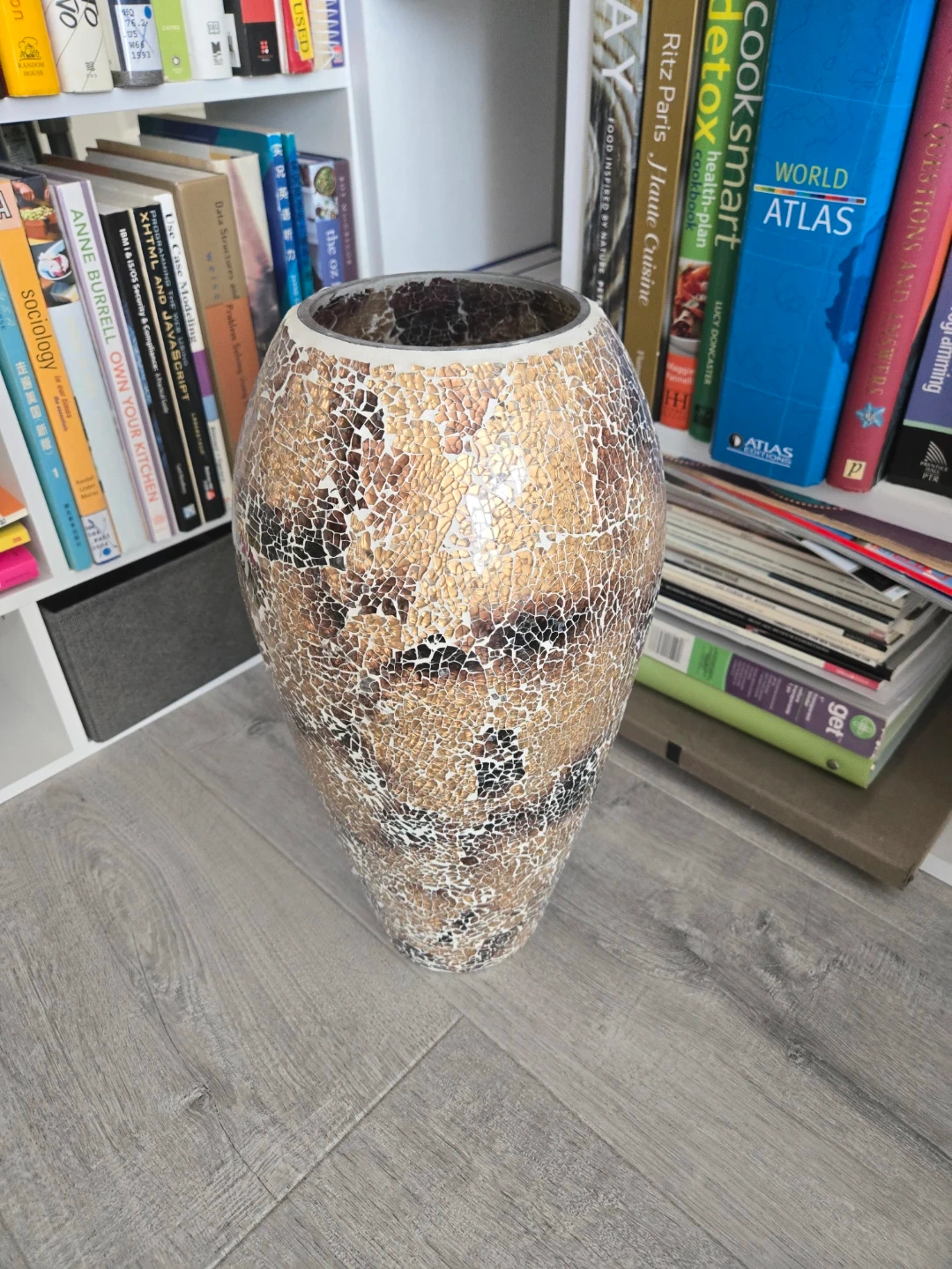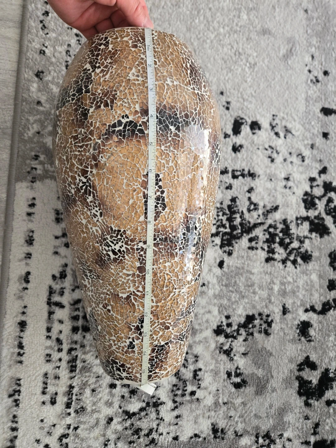 Decorative mosaic vase with a crackle glass finish. Gold, black, and white tones. Interior has a subtle purple hue. It's approximately 12 inches tall and 5 inches wide at its widest point. Beautiful accent piece for any room!