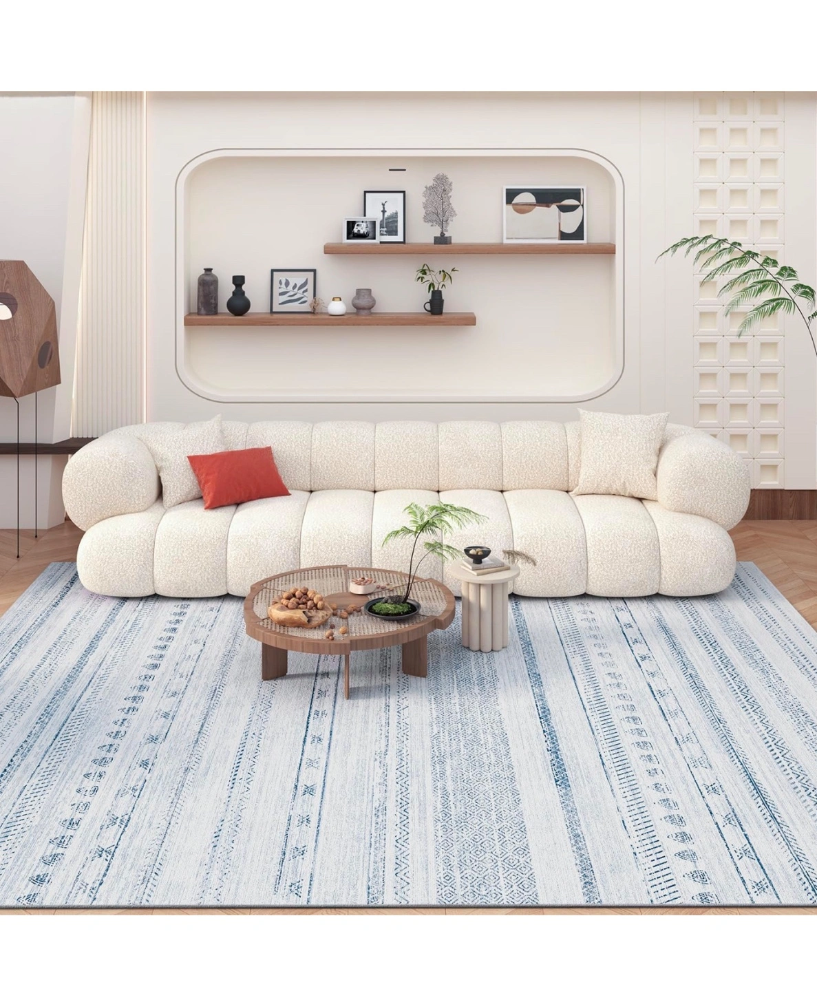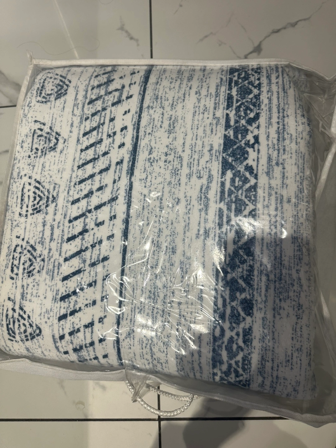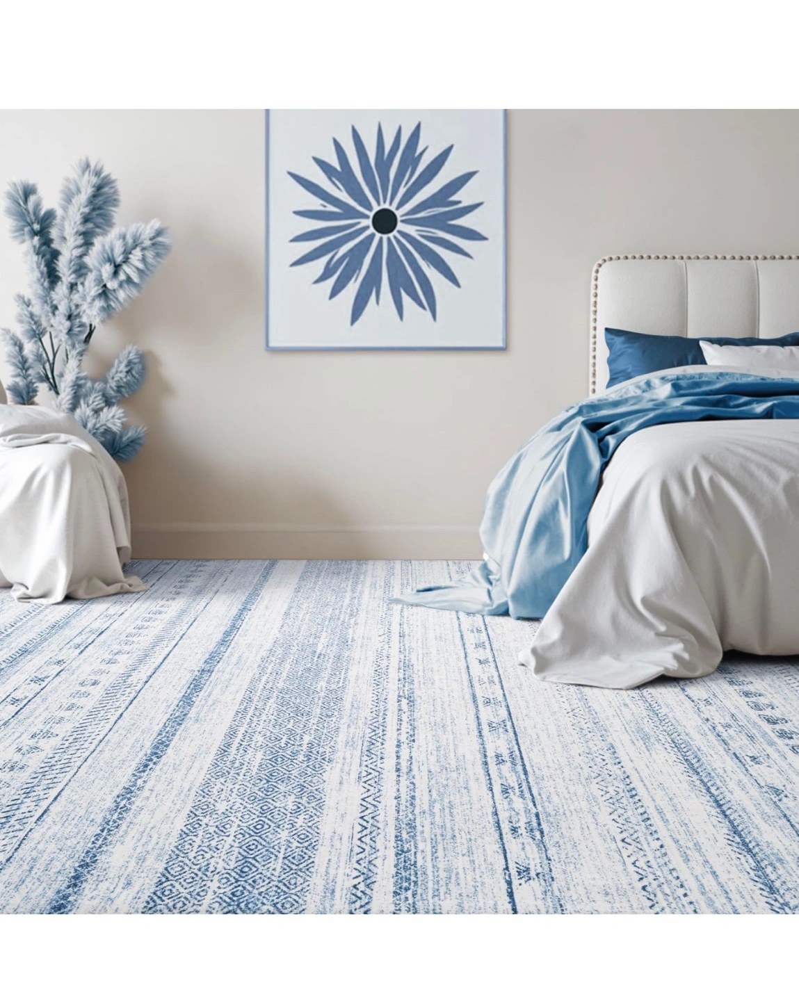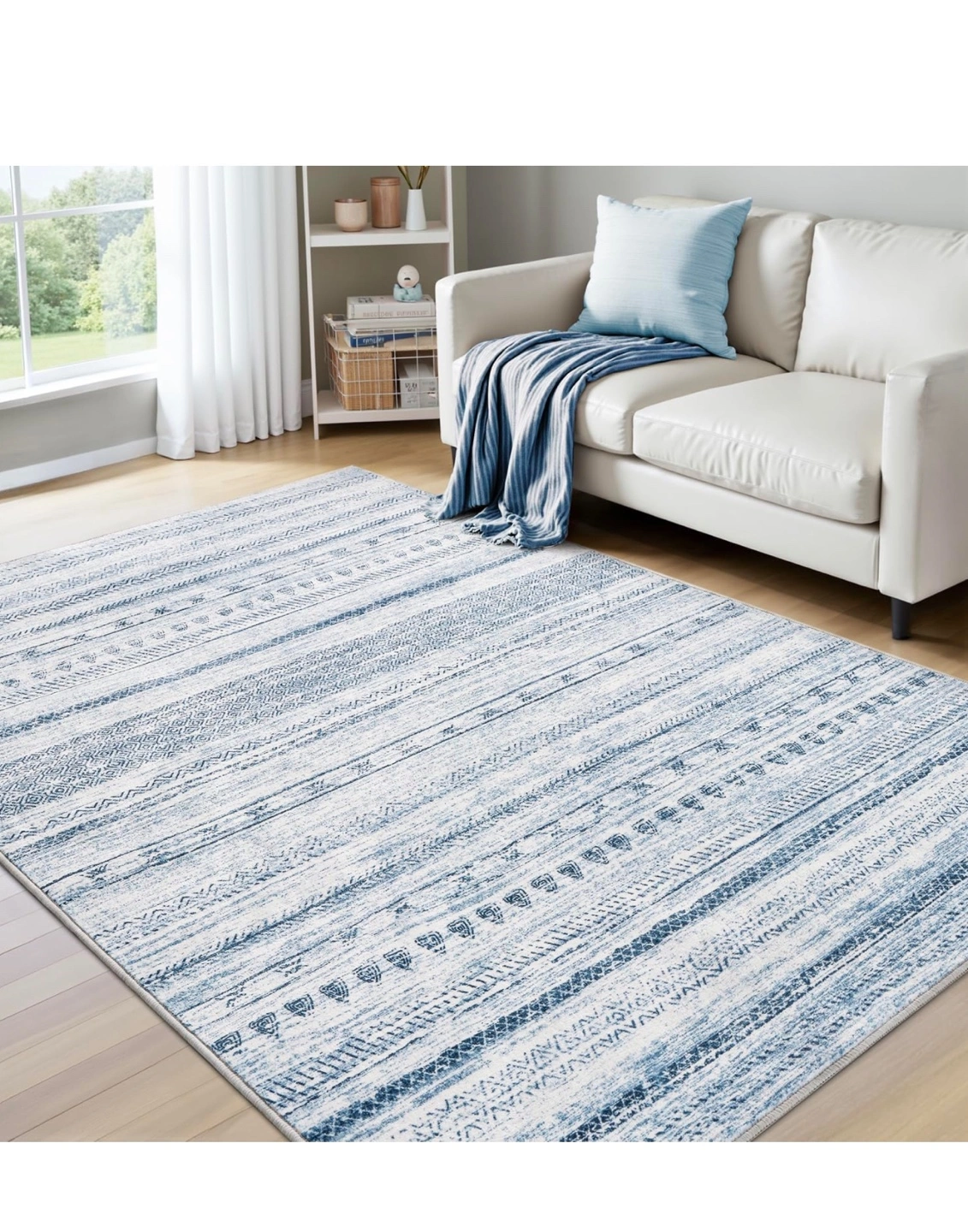 Beautiful blue and white area rug. Features a striped pattern with various geometric designs. Soft and comfortable underfoot. Perfect for living room or bedroom. New, never used