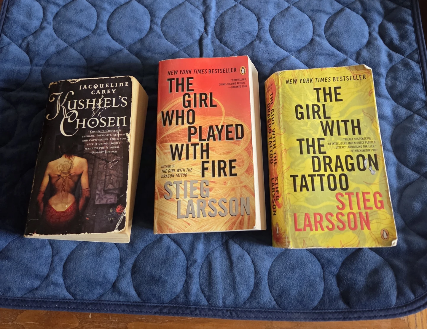 #🤎FREE Three novels are included: Kushiel's Chosen by Jacqueline Carey, and The Girl with the Dragon Tattoo and The Girl Who Played with Fire by Stieg Larsson. These are paperback editions. They're great reads for thriller and fantasy fans.