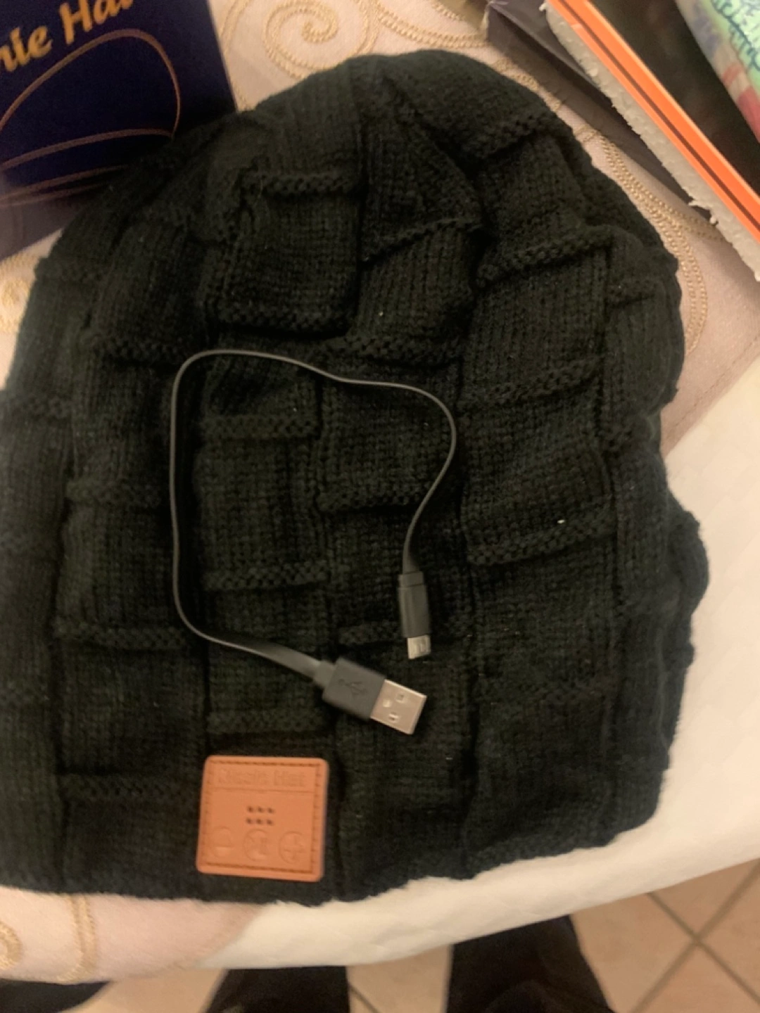 New black Bluetooth beanie. Wireless Bluetooth functionality. Includes charging cable. Made in China.