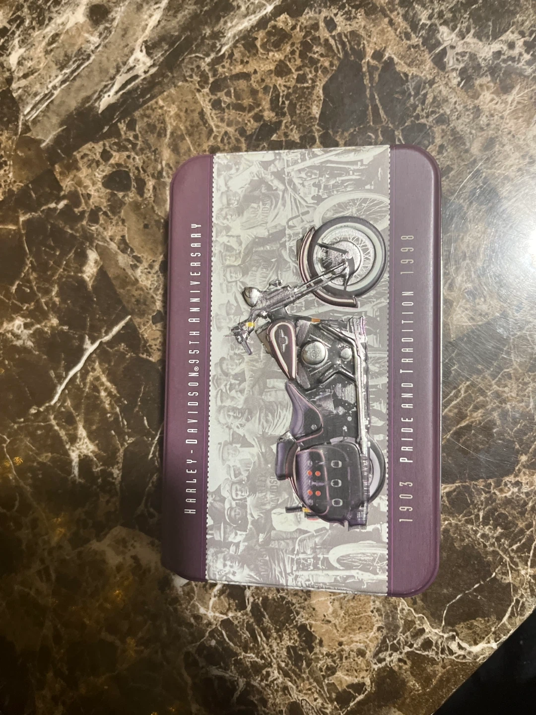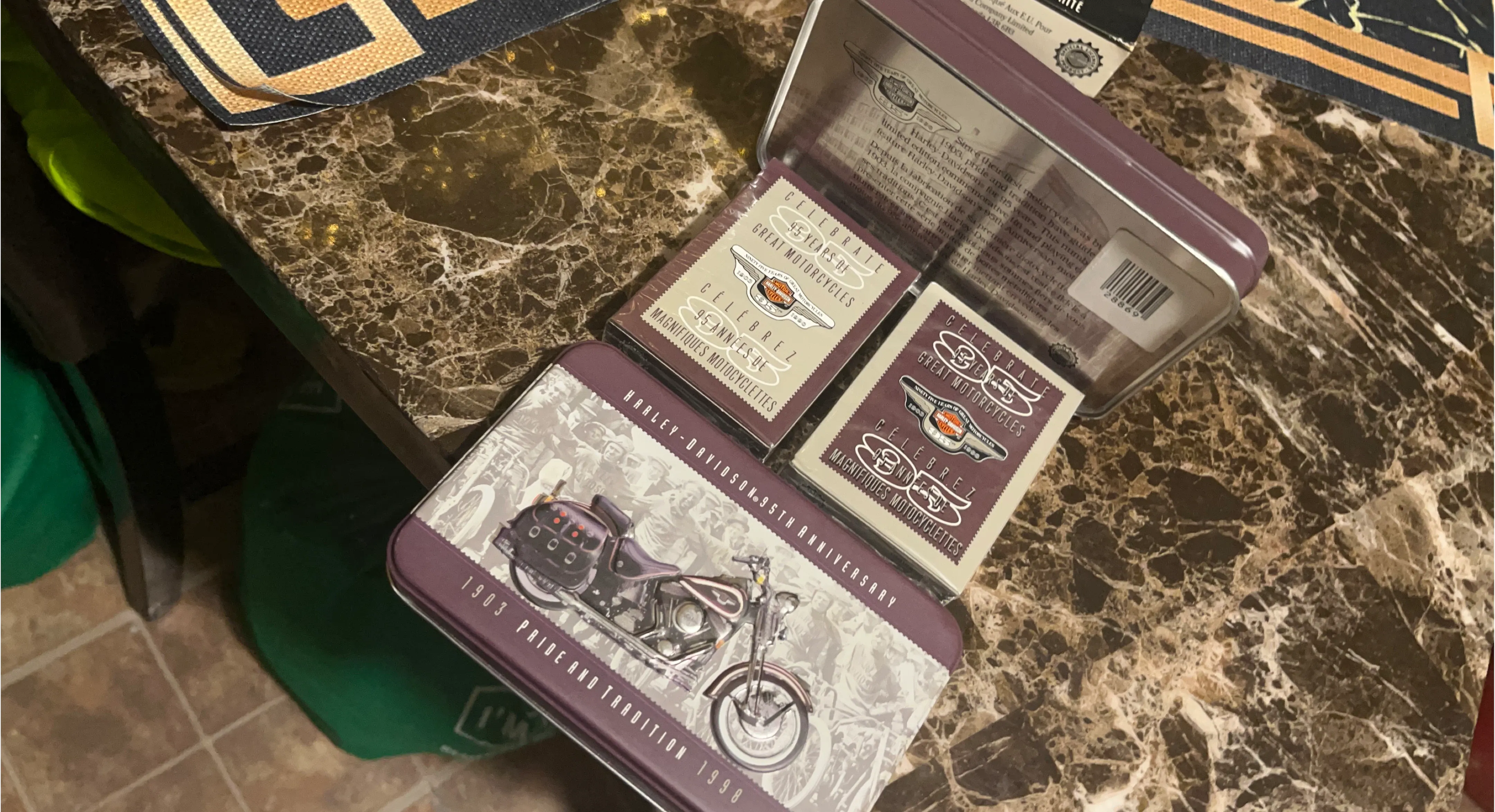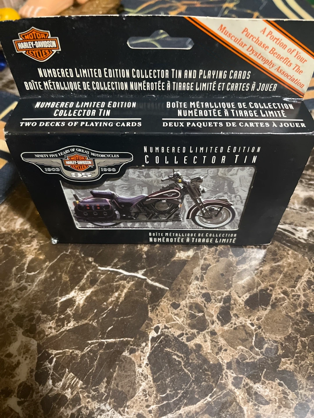 This tin features two decks of playing cards celebrating Harley-Davidson's 95th Anniversary. It's a nice collectible for motorcycle enthusiasts. Includes original tin packaging.