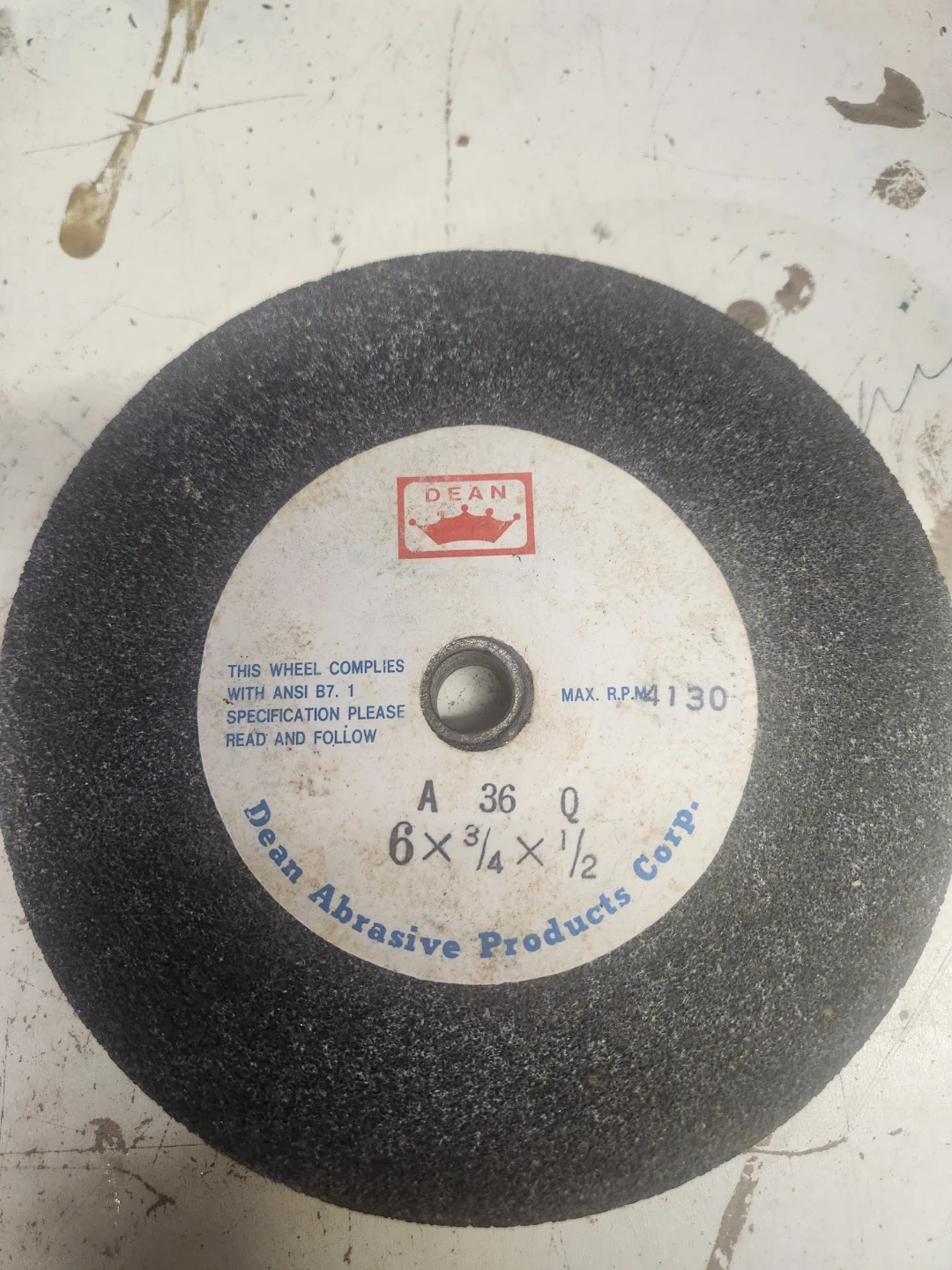 This is a Dean Abrasive Products grinding wheel. It measures 6 inches in diameter, 3/4 inch arbor hole, and 1/2 inch thickness. It complies with ANSI B7.1 specification.