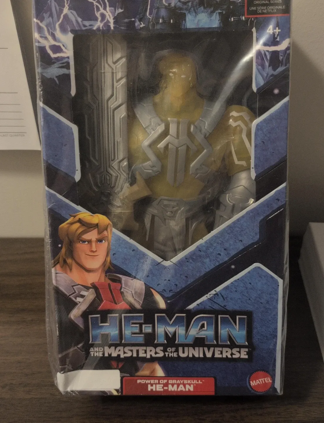 This is the He-Man action figure from Mattel's Masters of the Universe line. It's part of the Power of Grayskull collection. The figure is suitable for ages 4 and up. It comes in its original packaging.