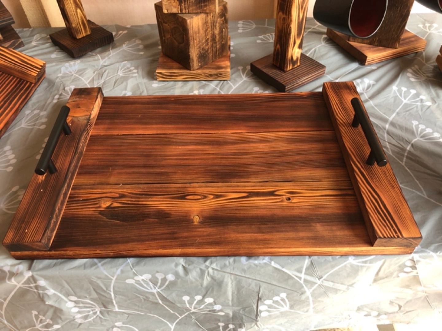 Large rectangular tray. Dark brown wood. Black metal handles on each side. Perfect for serving or displaying items. Beautifully charred and stained.